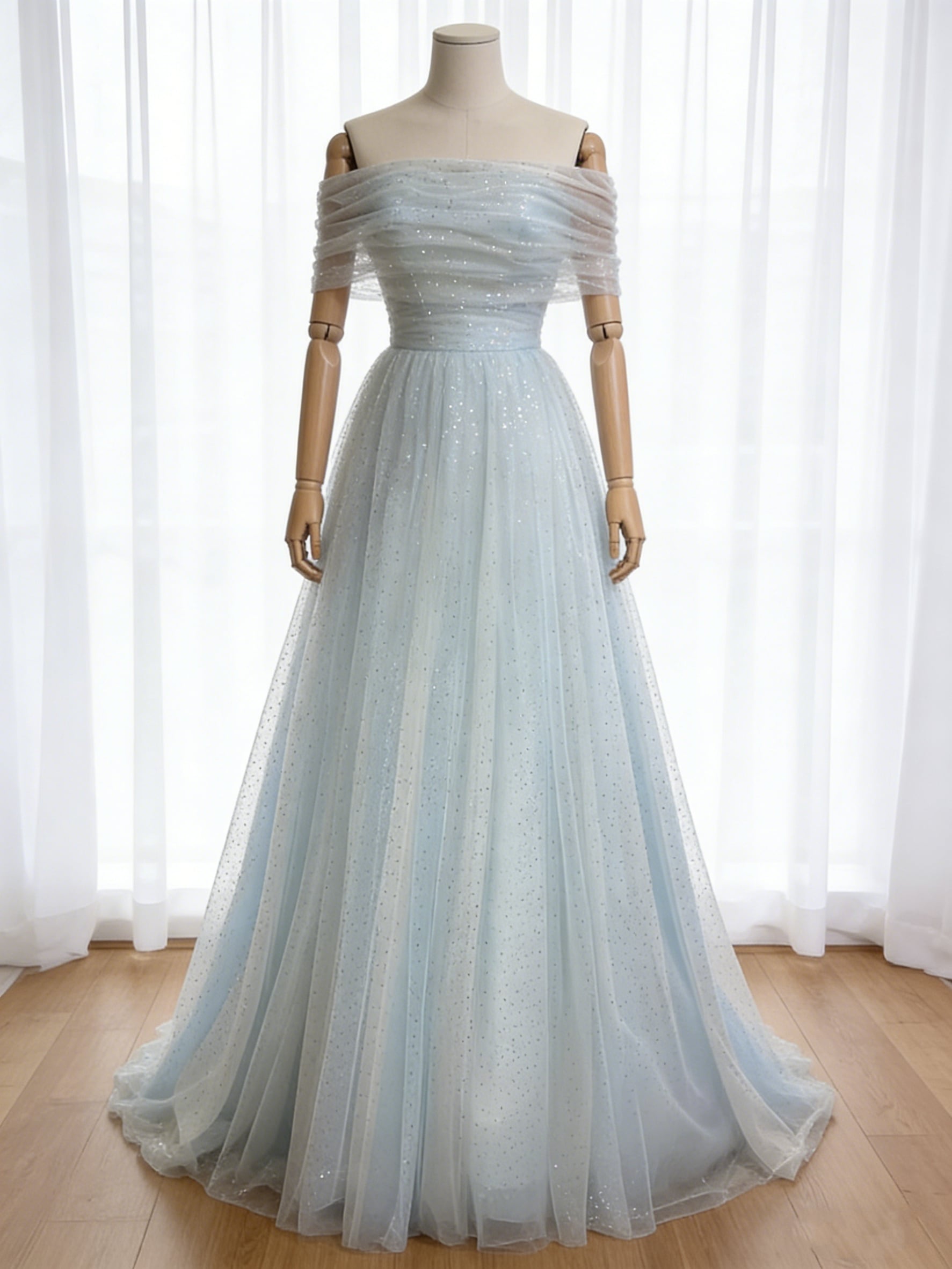 カラードレス 爽やかで優しいブルー オフショルダー 音楽会/発表会など キラキラドレス Aライン パーティーワンピース