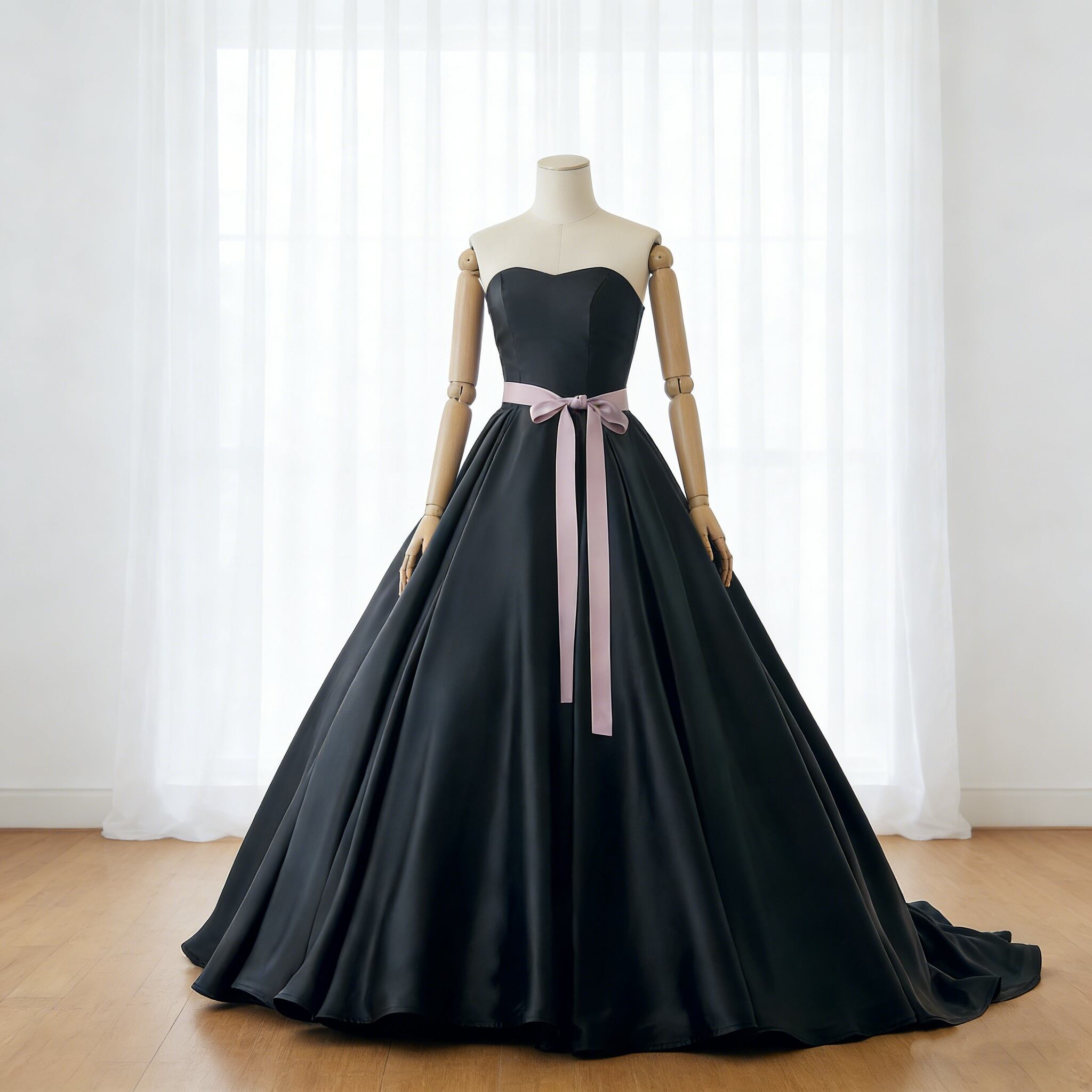 パーティードレス ブラック 光沢サテン サッシュベルト 前撮り エレガント ビスチェドレス