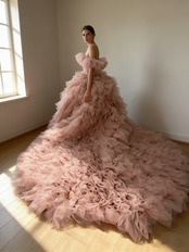 カラードレス オフショルダー もこもこドレス ピンク ラッフルフリル 華やかなトレーン プリンセスライン