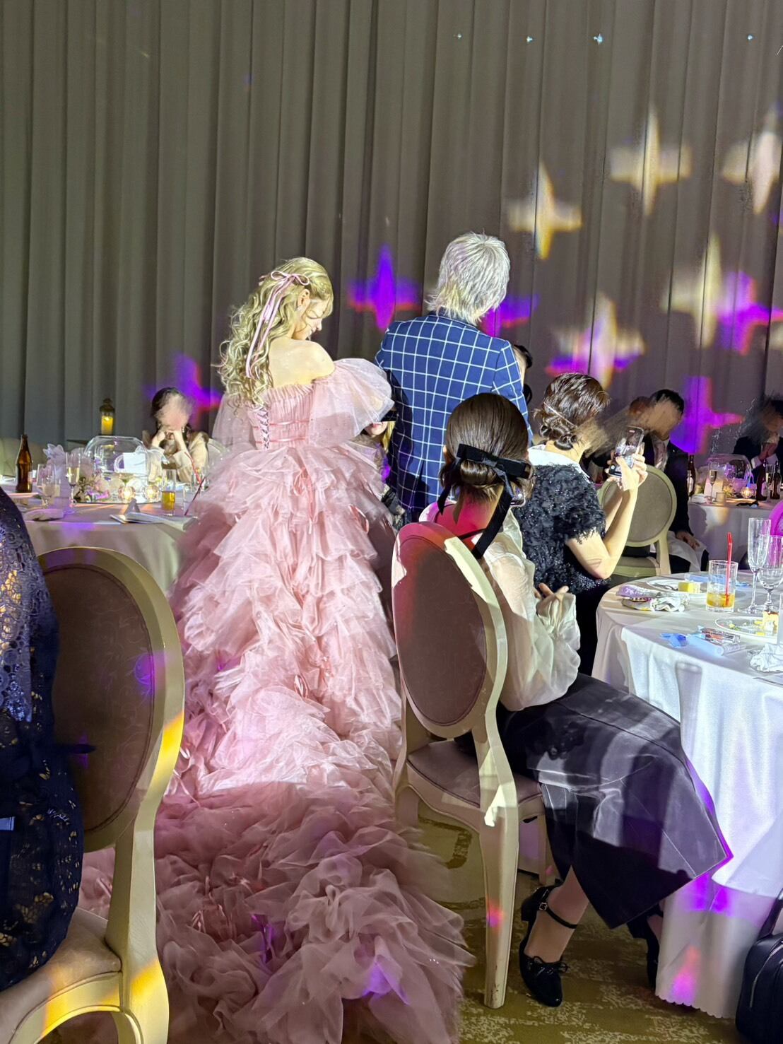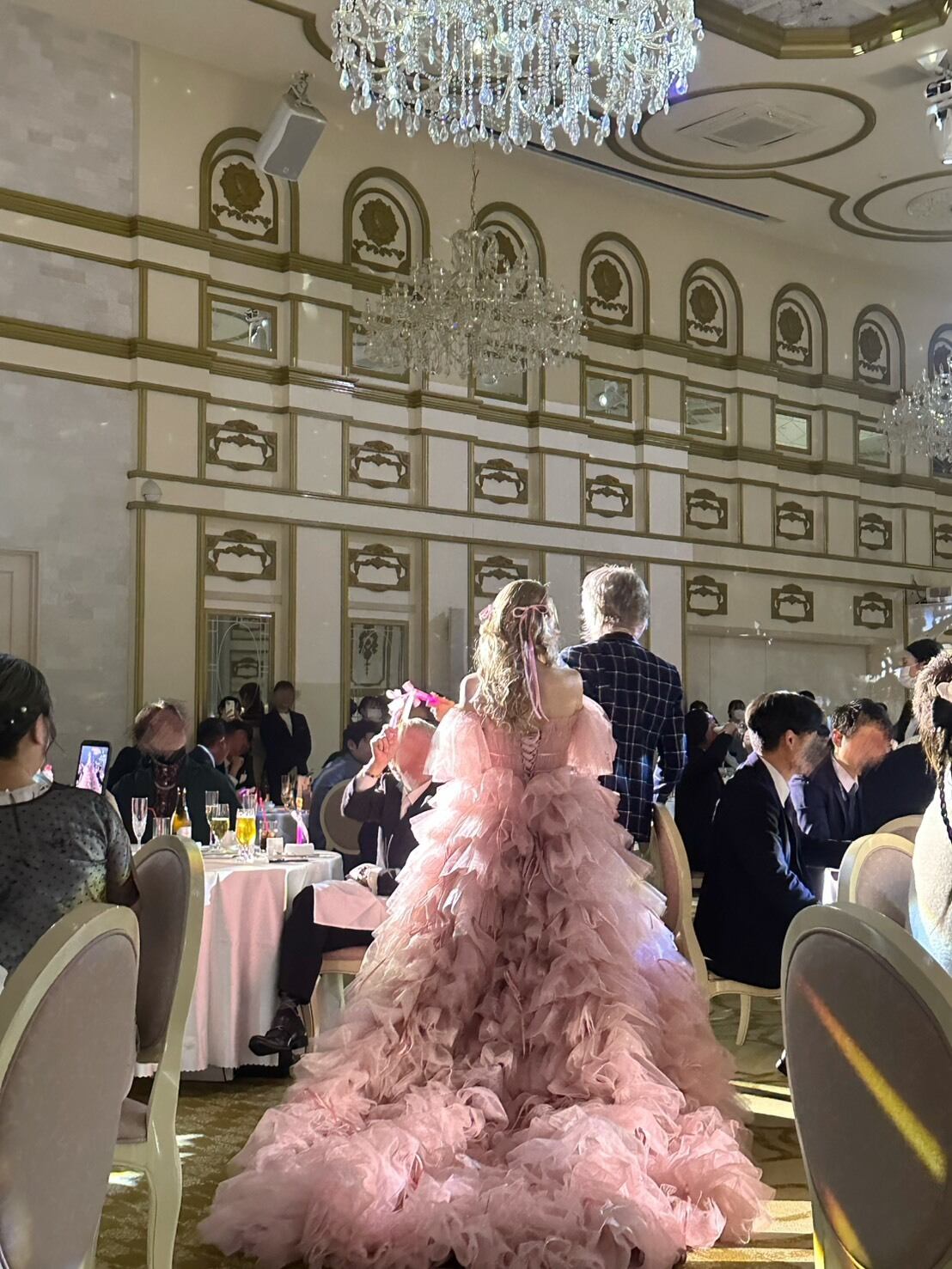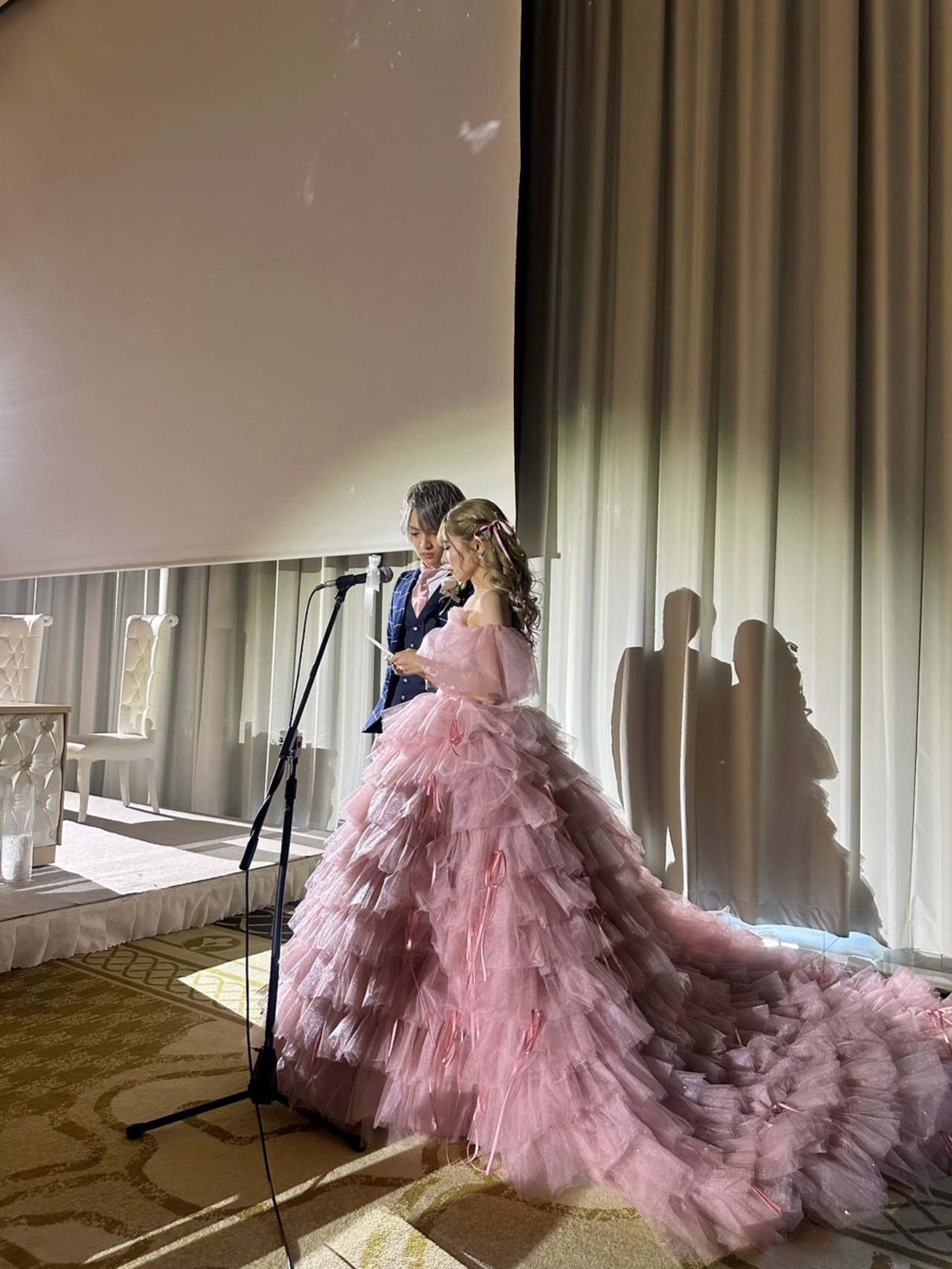 実例写真!カラードレス ピンク フリル袖 ティアードのドレス プリンセスライン 前撮り 結婚式 キラキラチュール 花嫁