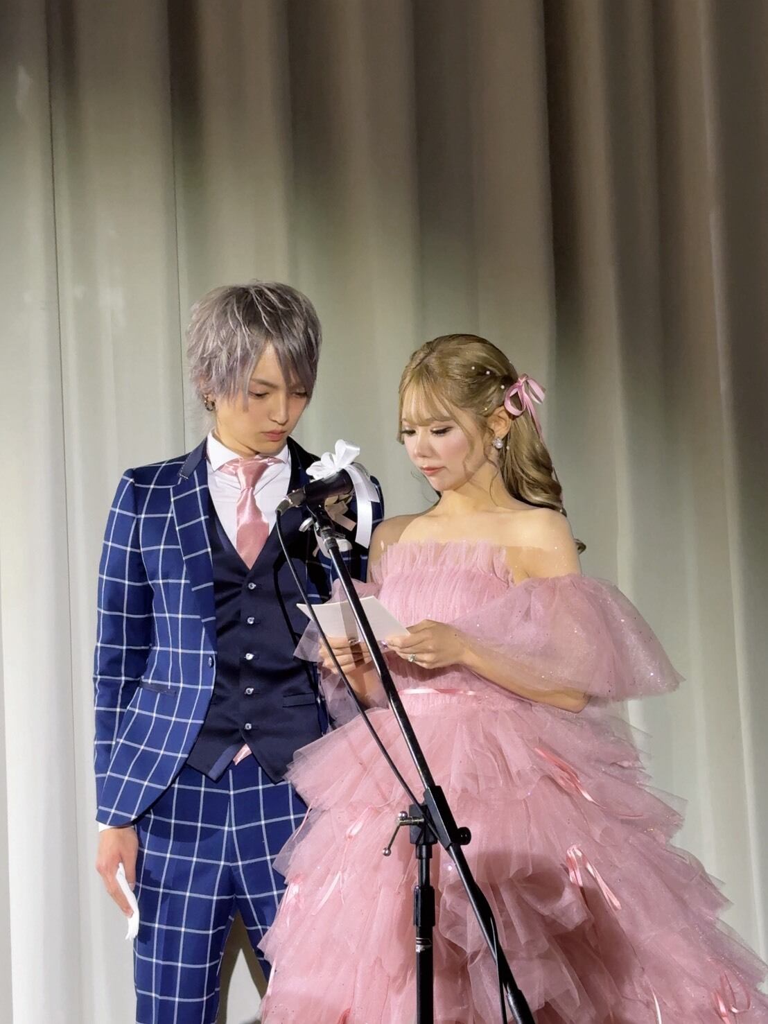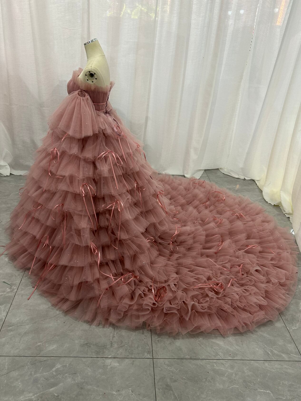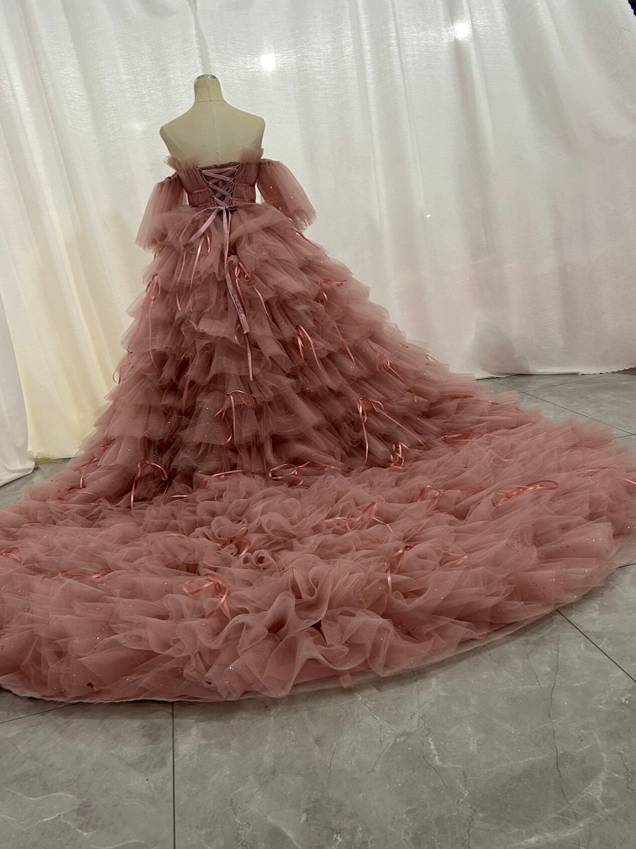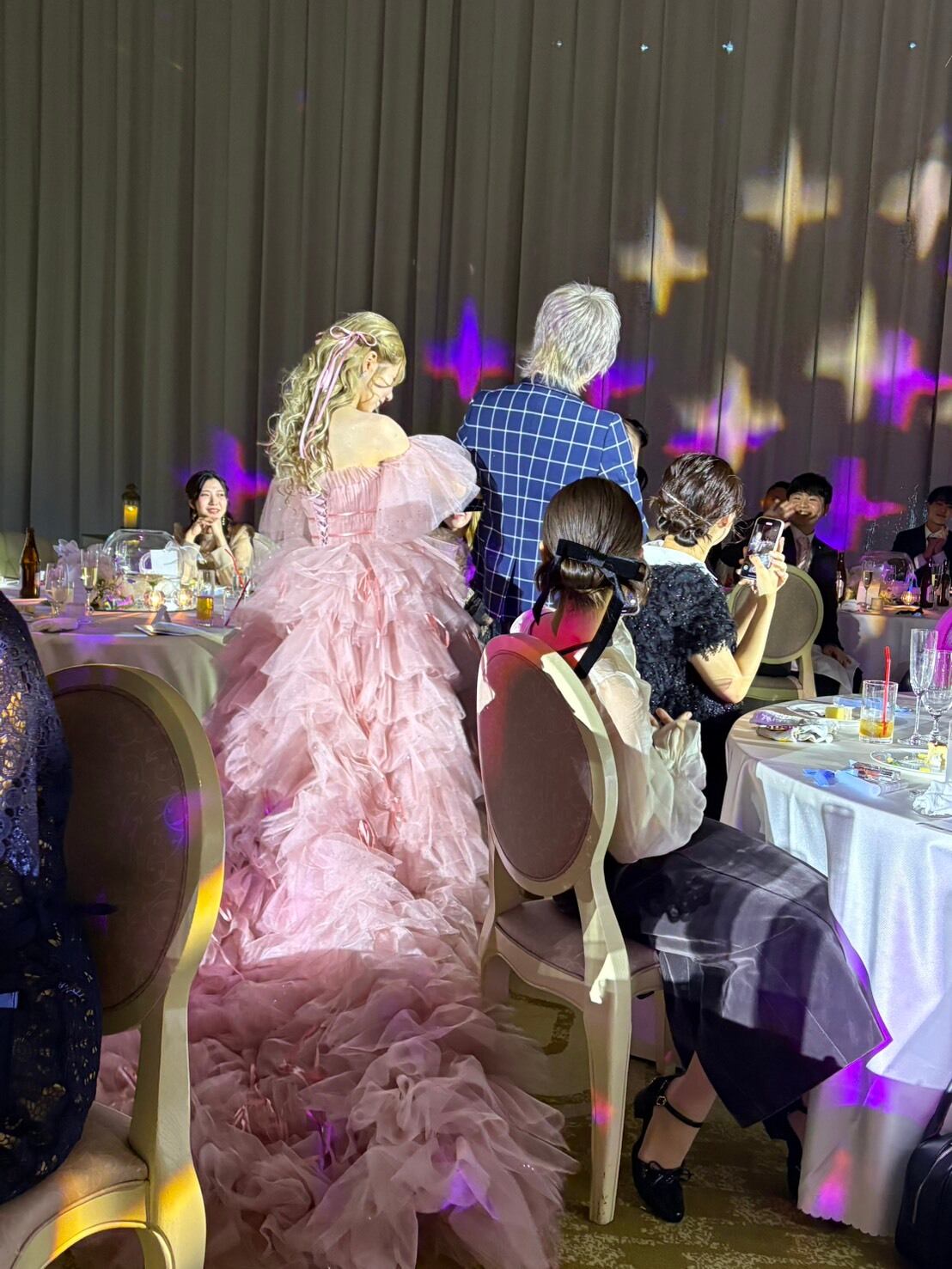 実例写真!カラードレス ピンク フリル袖 ティアードのドレス プリンセスライン 前撮り 結婚式 キラキラチュール 花嫁