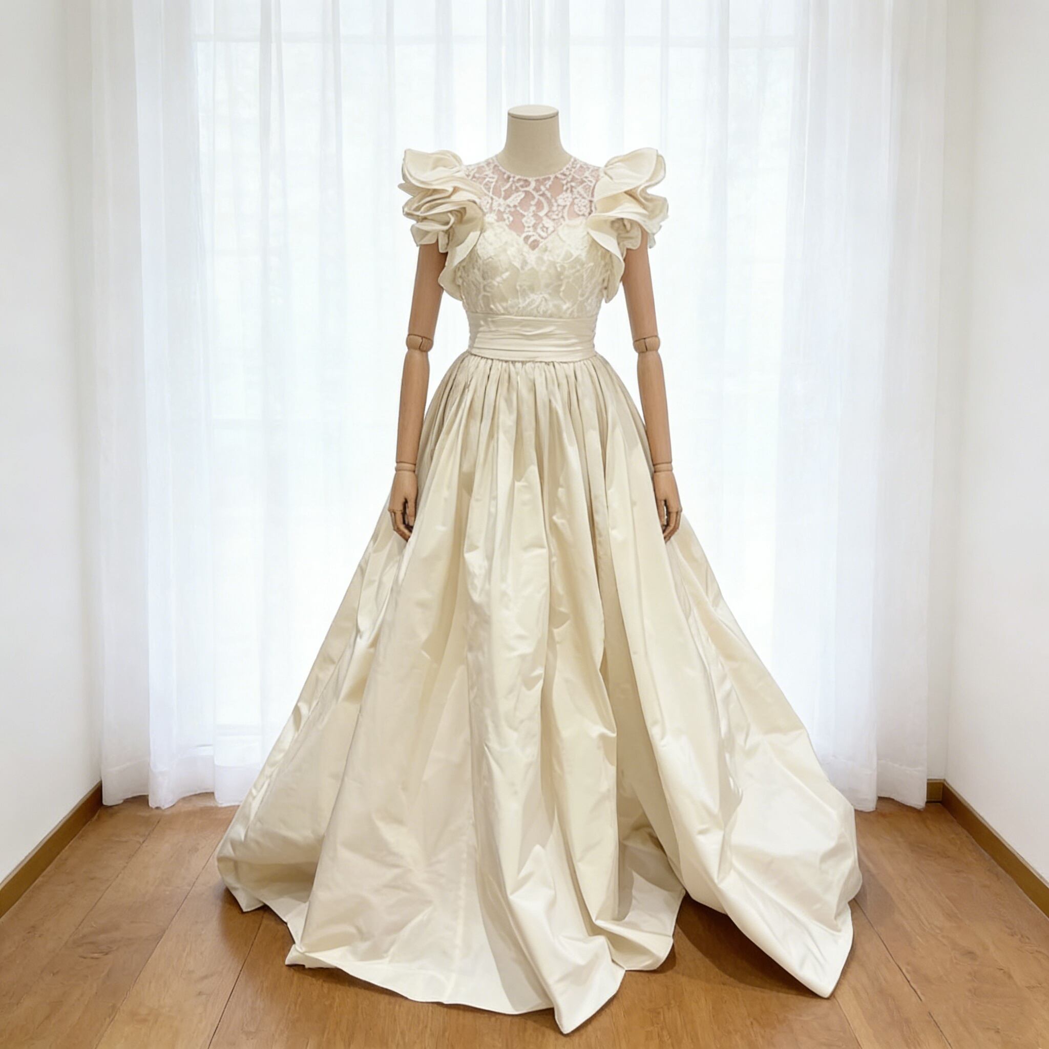 ウェディングドレス シルクタフタ アイボリー エレガント 姫袖 流れる透け花レース 結婚式