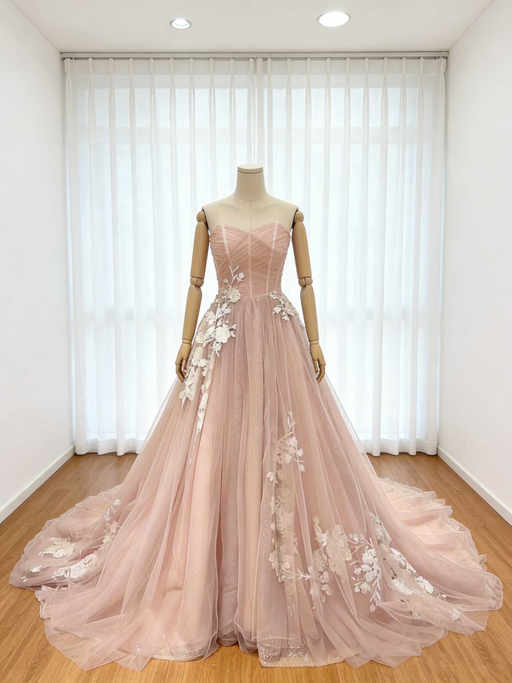 カラードレス ピンク 魅惑の花レース ハンドドレープ 揺らめく裾 柔らかく重ねたチュールスカート 花嫁