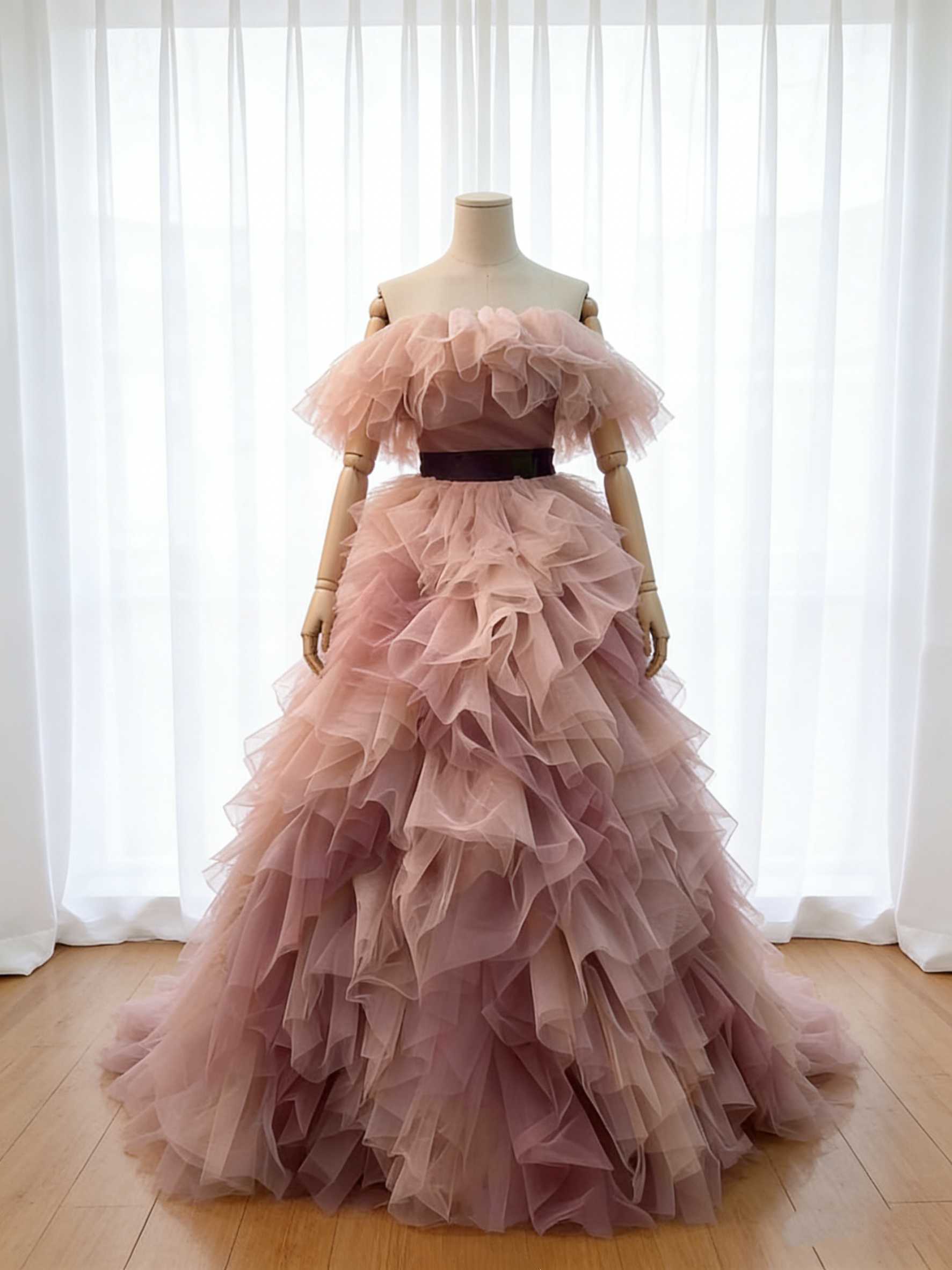 カラードレス もも色 取り外しオフショルダー もこもこドレス 編み上げ 華やか 結婚式 花嫁