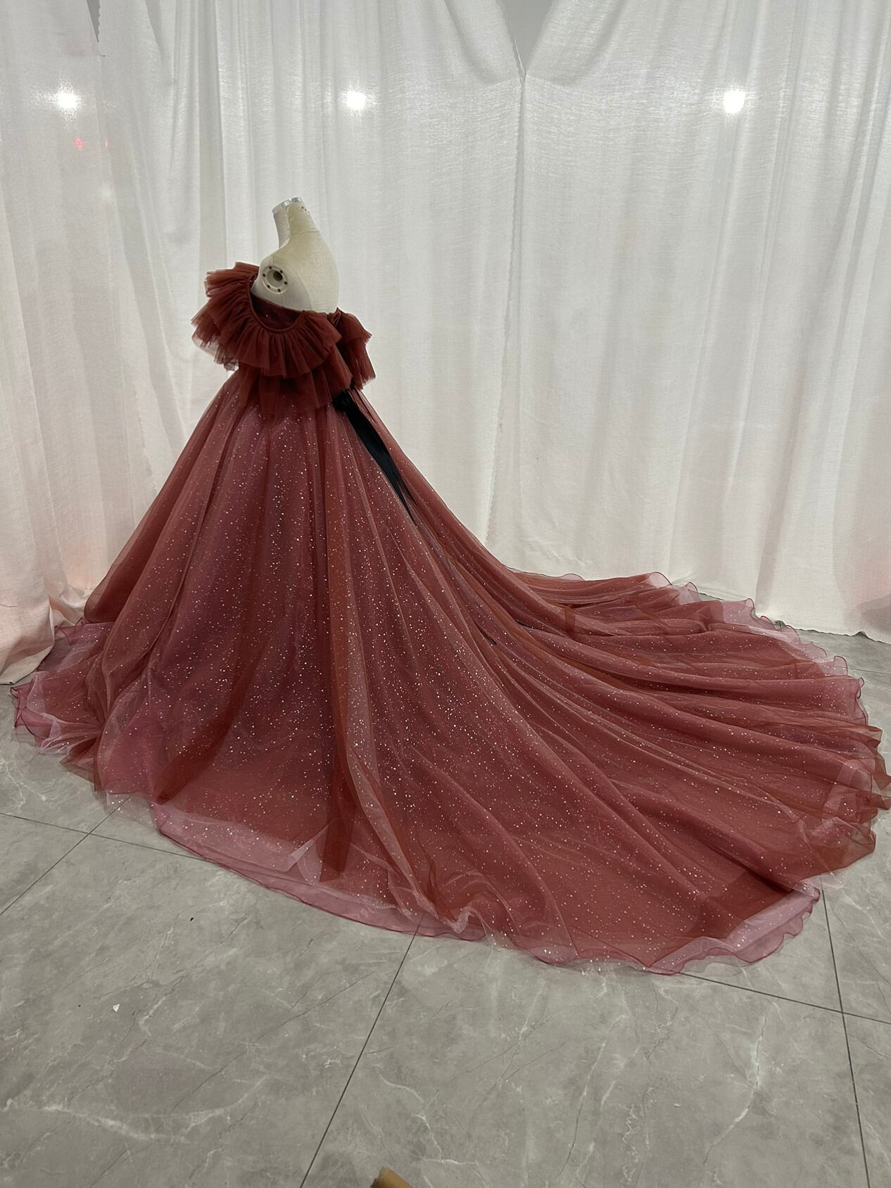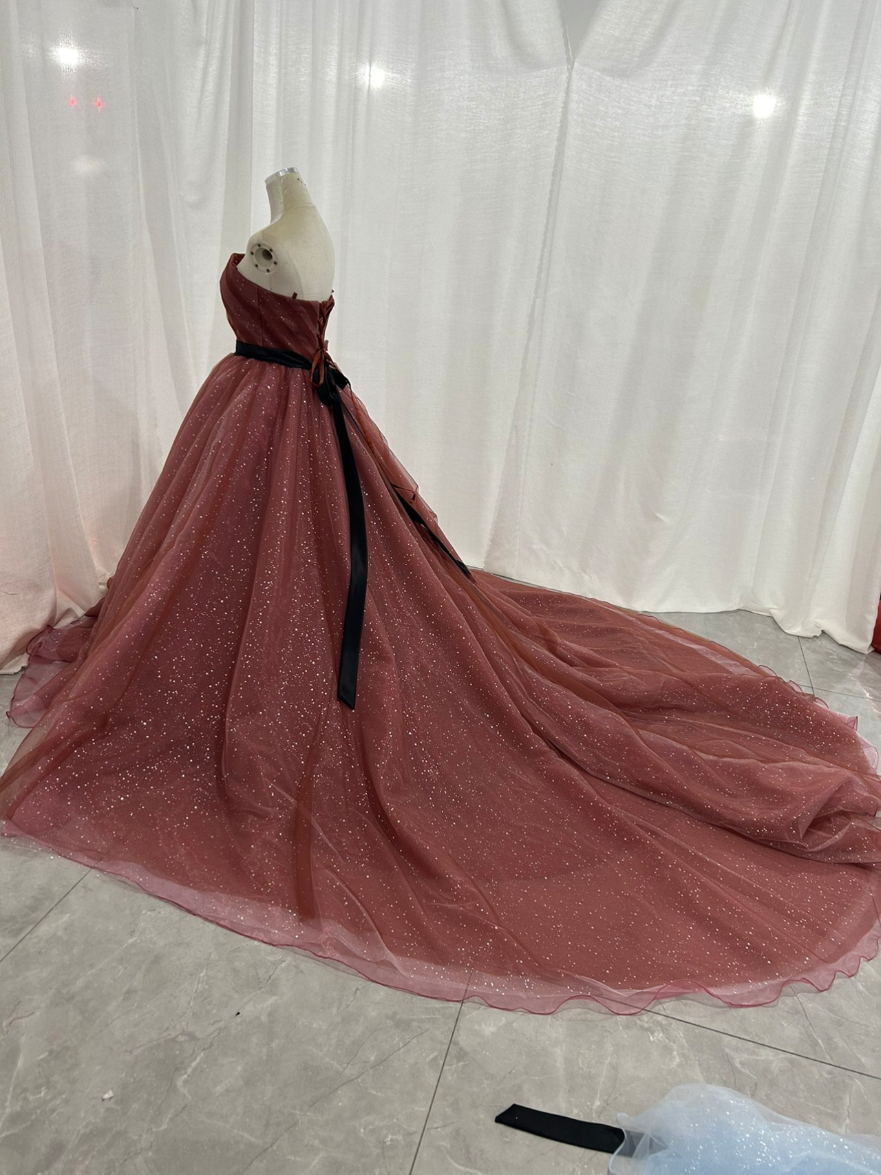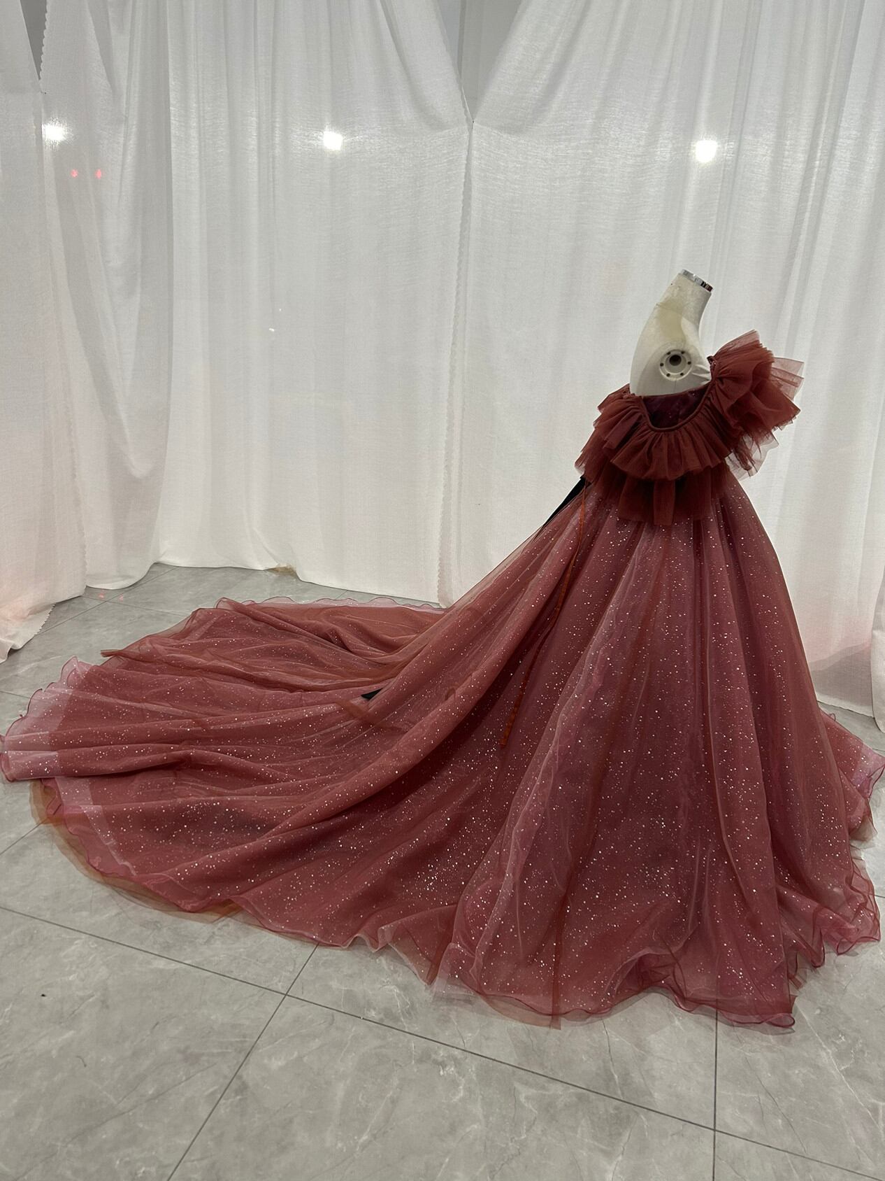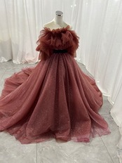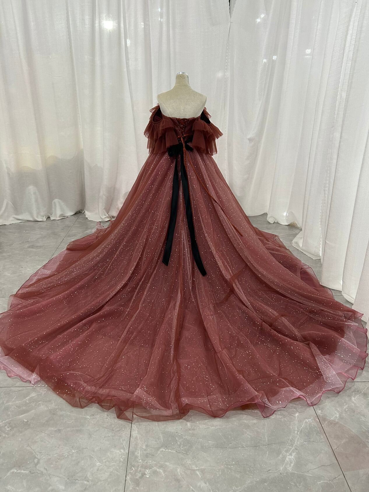 カラードレス 取り外し可能なオフショルダー テラコッタ色 キラキラグリッターチュール ベルト 編み上げ 結婚式