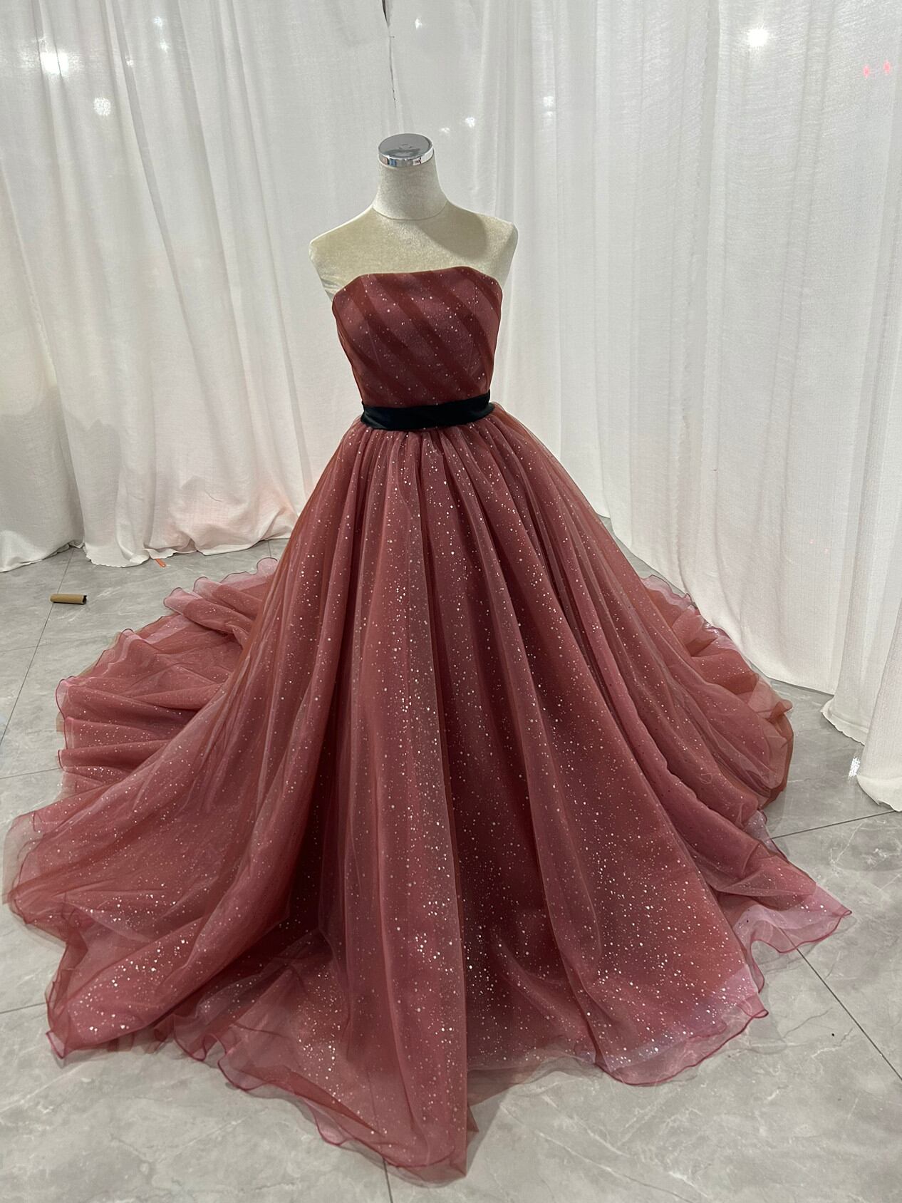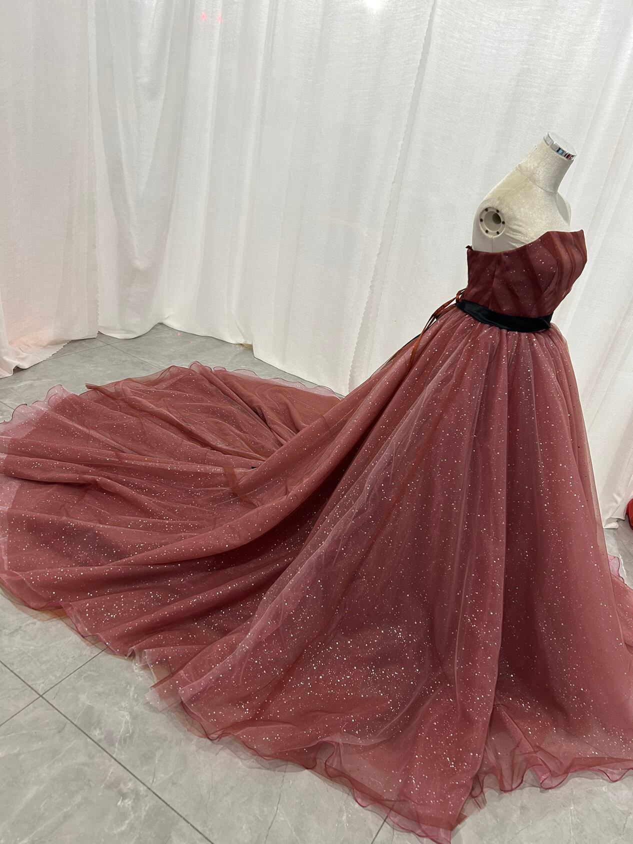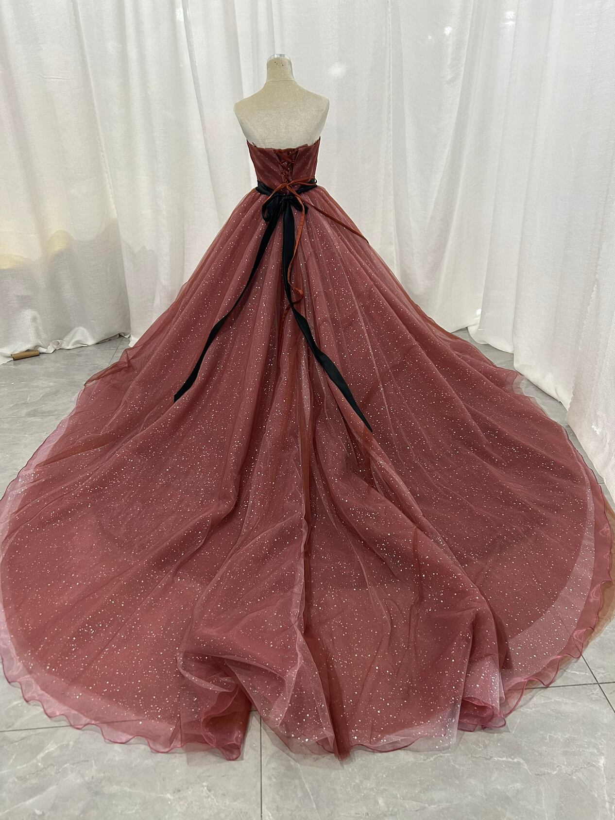 カラードレス ビスチェドレス テラコッタ色 キラキラグリッターチュール ベルト 編み上げ 結婚式