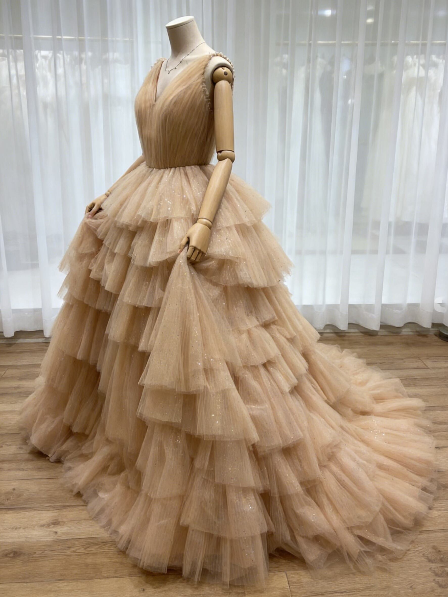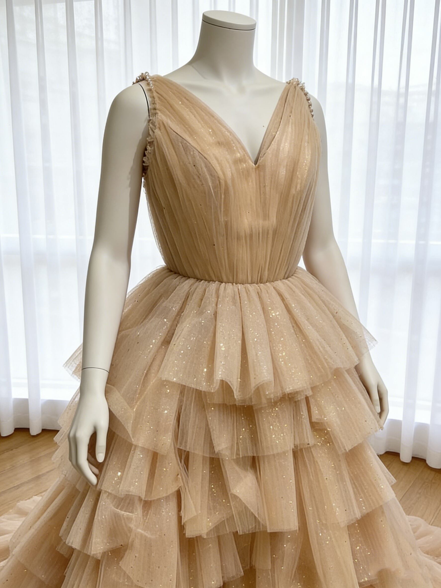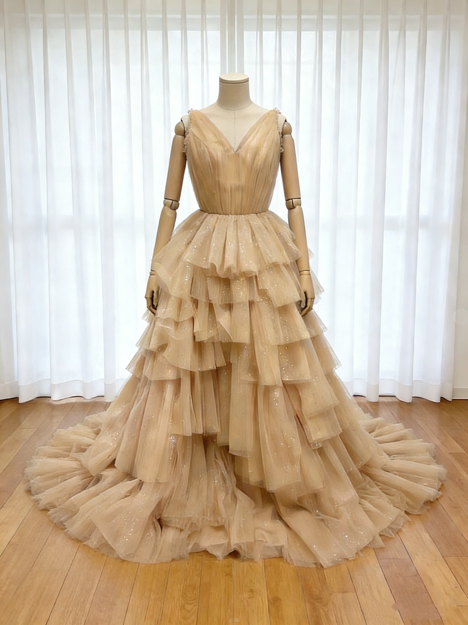 カラードレス 薄シャンパン色 Vネックドレス キャミソール アシンメトリードレス キラキラドレス 前撮り 結婚式