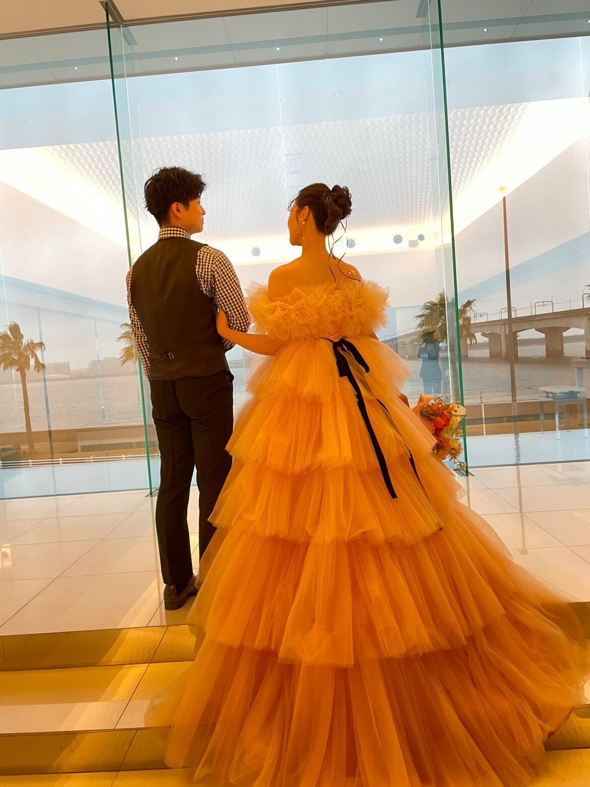 実例写真!カラードレス オレンジ 取り外し可能なオフショルダー ティアードのドレス プリーツドレス キラキラチュール