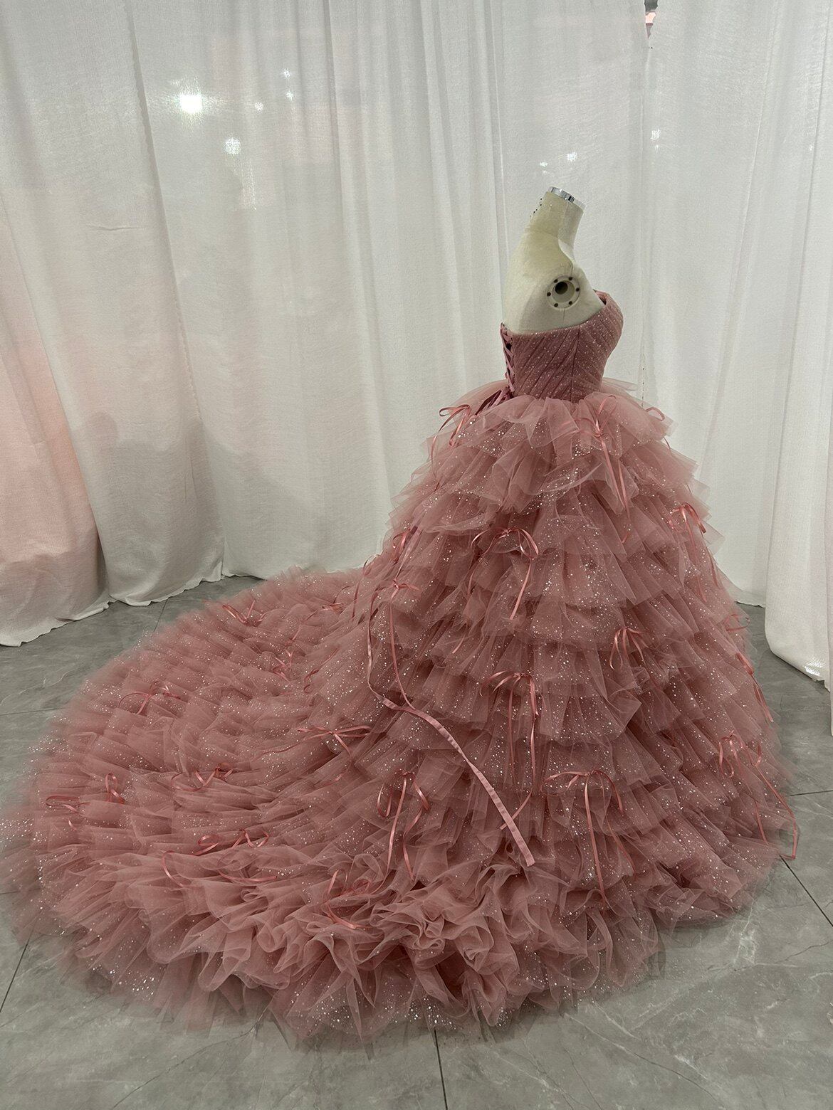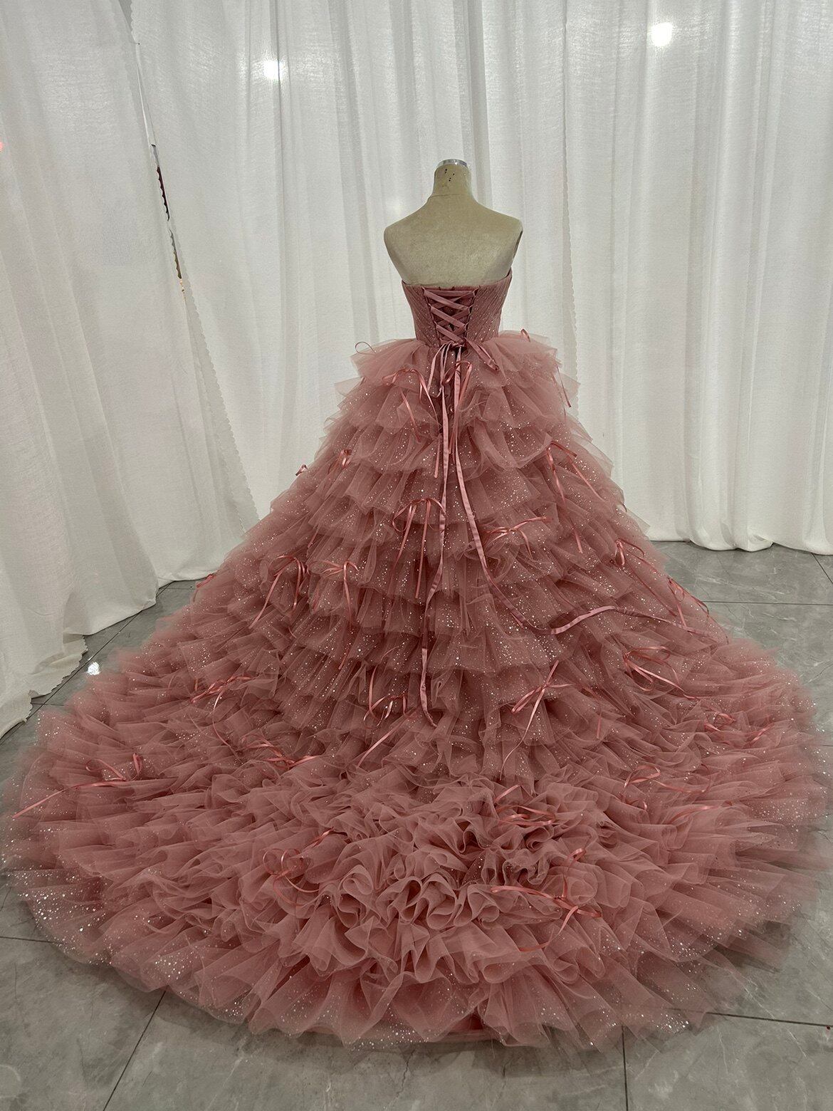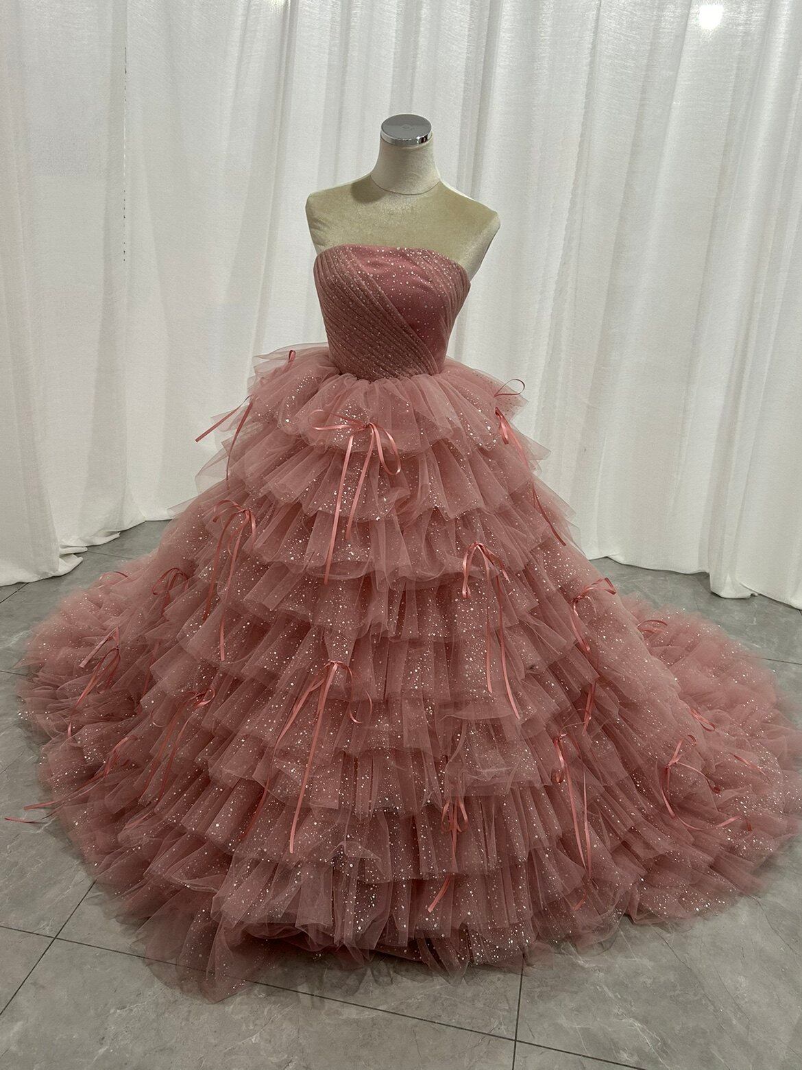 カラードレス ピンク もこもこドレス リボン 編み上げ 披露宴/結婚式 花嫁/ウェディングドレ 可愛い キラキ
