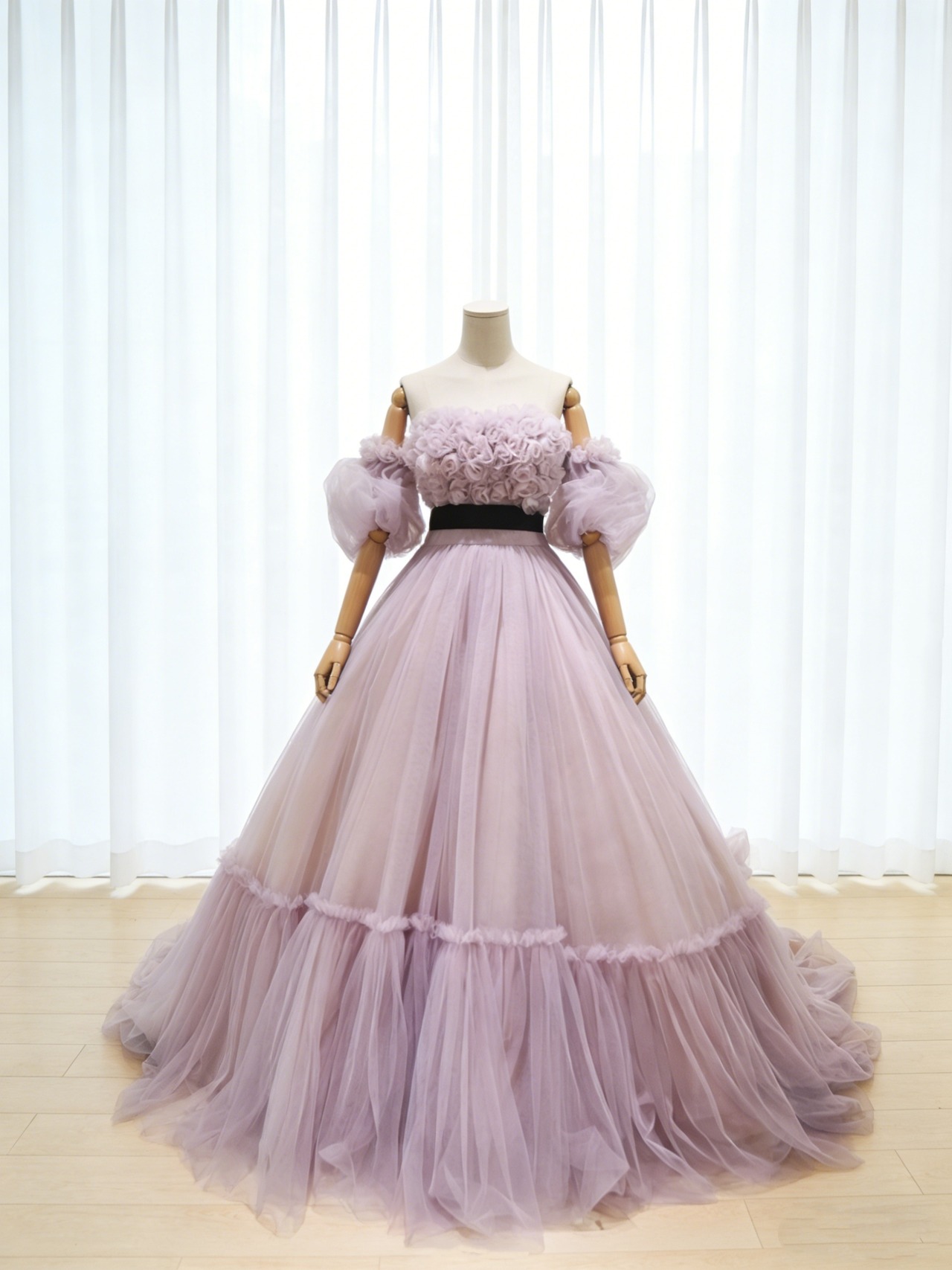 カラードレス パープル プリンセスライン バラトレーン サッシュベルト パフスリーブ 花嫁 憧れのドレス