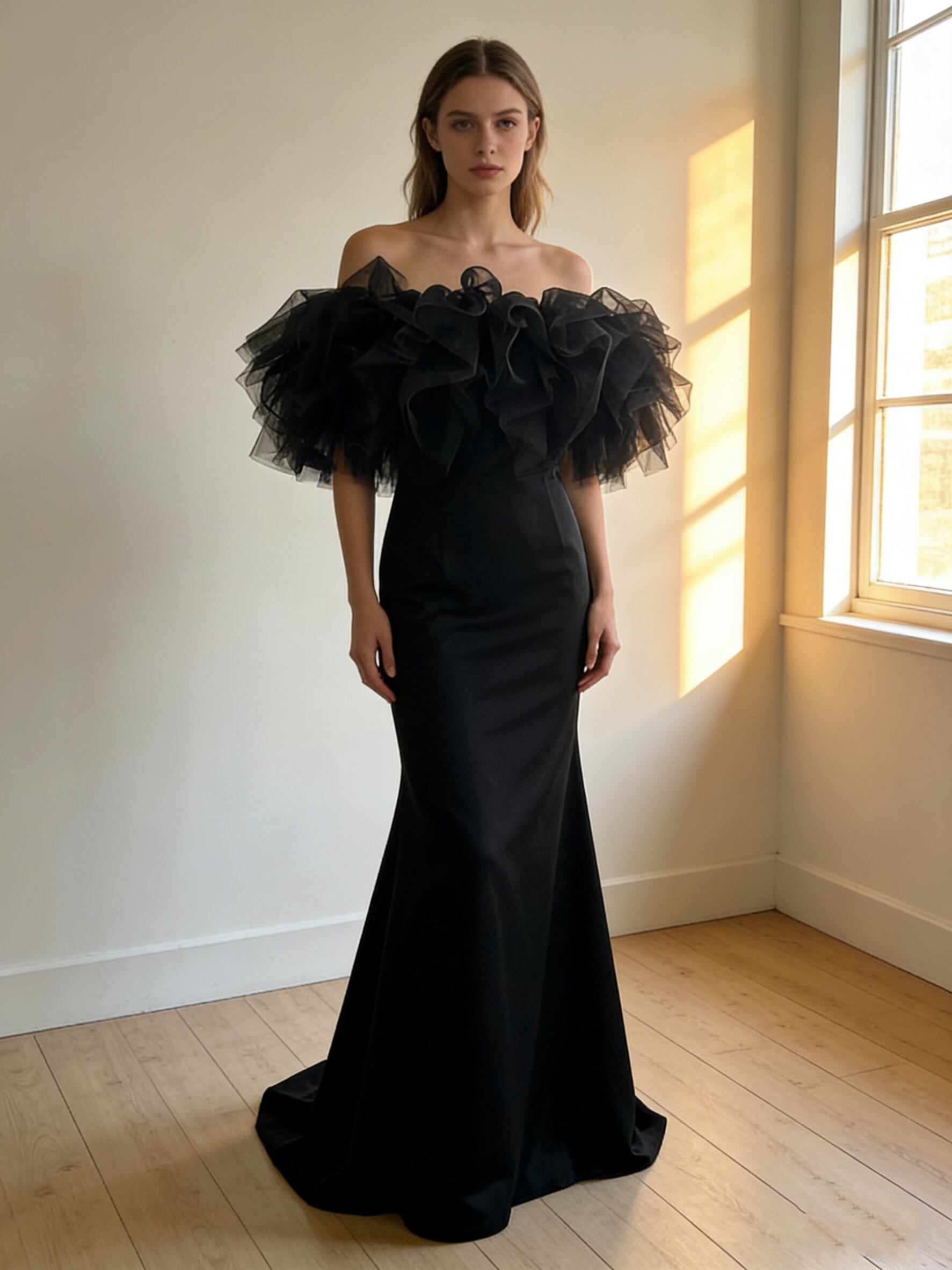 パーティードレス 前撮り 2次会 クレープ生地 マーメイドライン 取り外し可能なオフショルダー ブラック