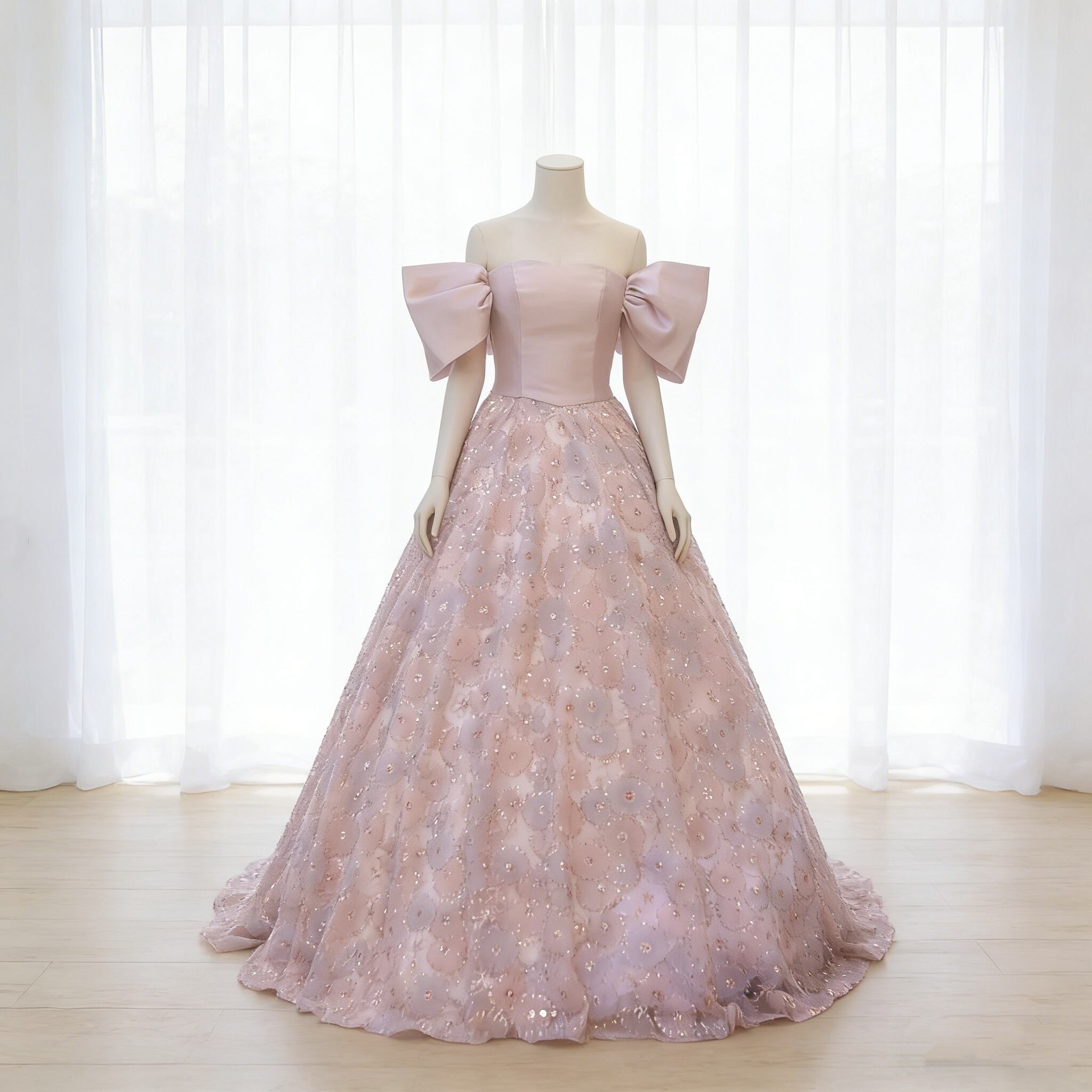 カラードレス ピンク 姫袖 3D立体レース刺繍 前撮り プリンセスライン 結婚式 抜群におしゃれ度が際立つ