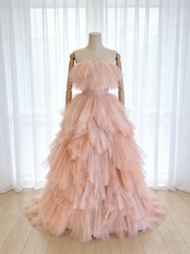 カラードレス ピンク もこもこドレス オフショルダー 結婚式 抜群におしゃれ度が際立つ プリンセスライン アシンメトリードレス