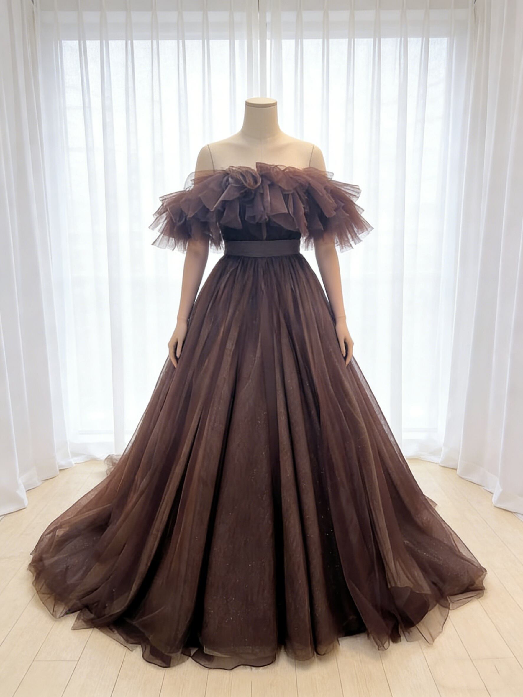 カラードレス コーヒー色 オフショルダー エレガント 前撮り 細見えシルエット キラキラチュール Aライン チュールスカート