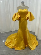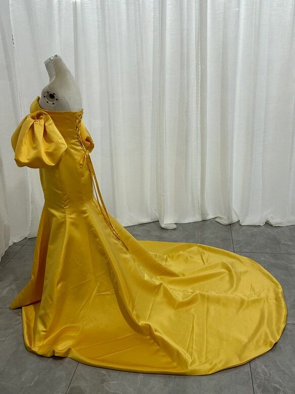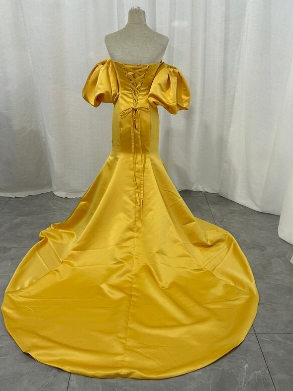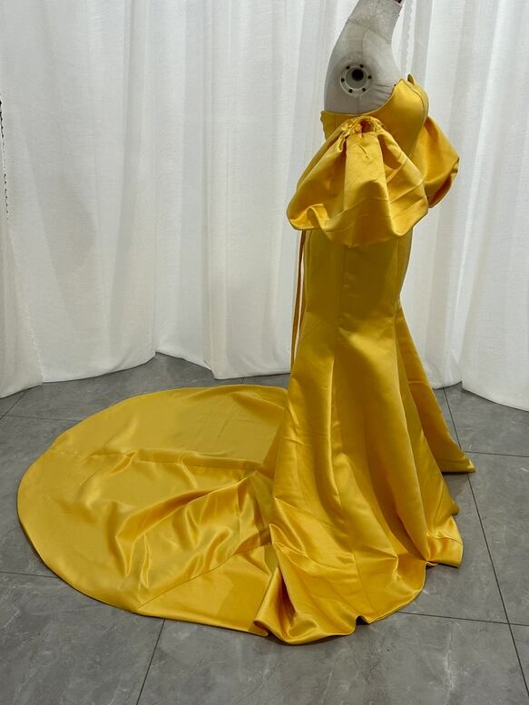 人気上昇!イエロー ベアトップ カラードレス ロングトレーン パーティードレス マーメイドライン 結婚式