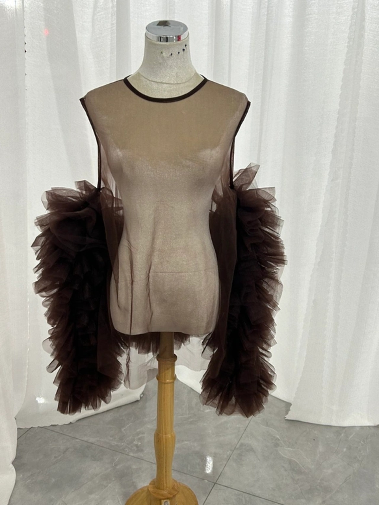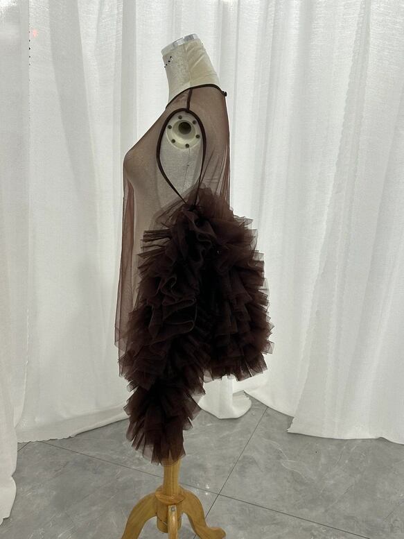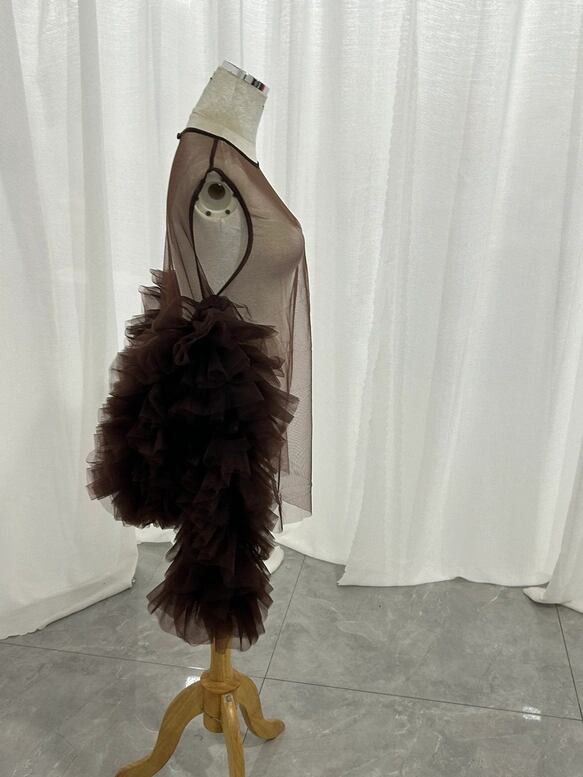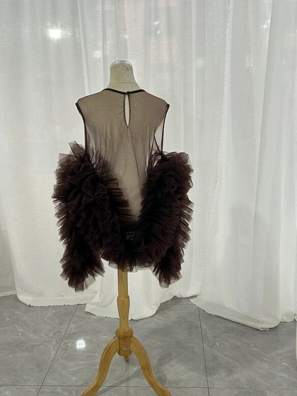 高品質!フェミニンなフレームレースの袖トップス ソフトチュールポンチョ ボレロ 焦茶に近いコーヒー色