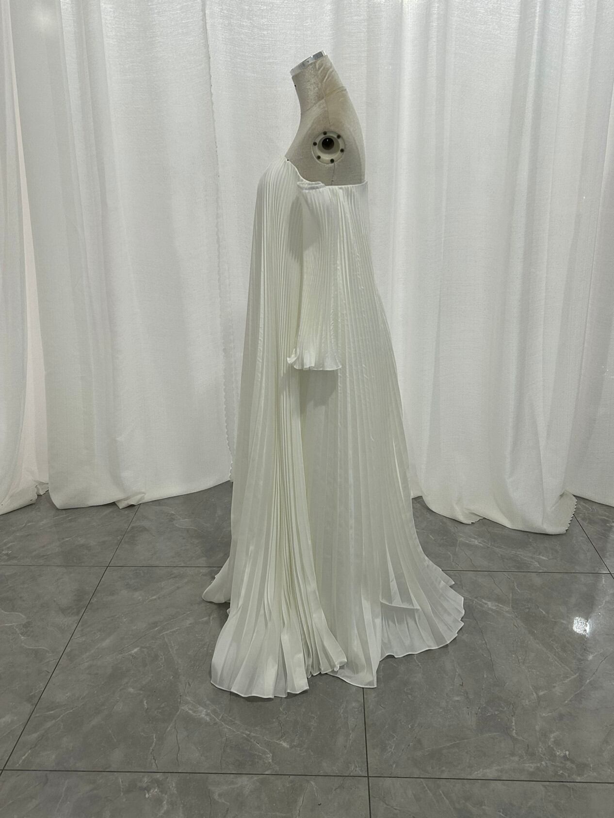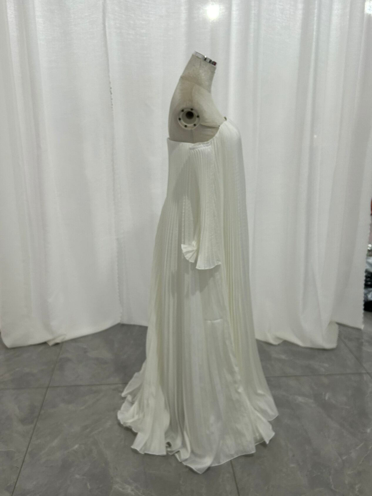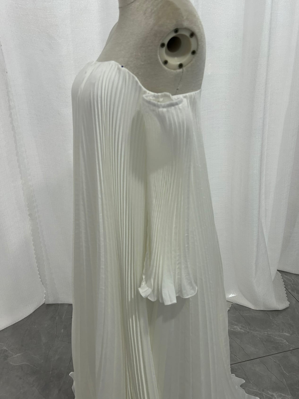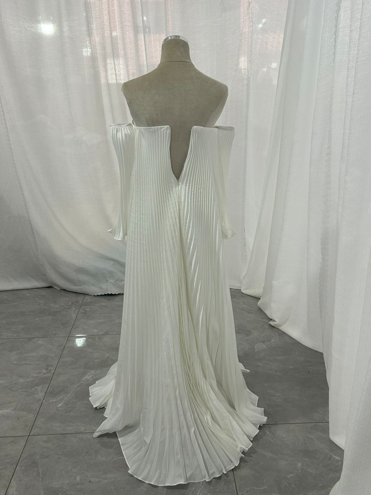 パーティードレス プリーツドレス ベアトップ 床付く 取り外し袖 シルクタフタ オフホワイト 披露宴/結婚式