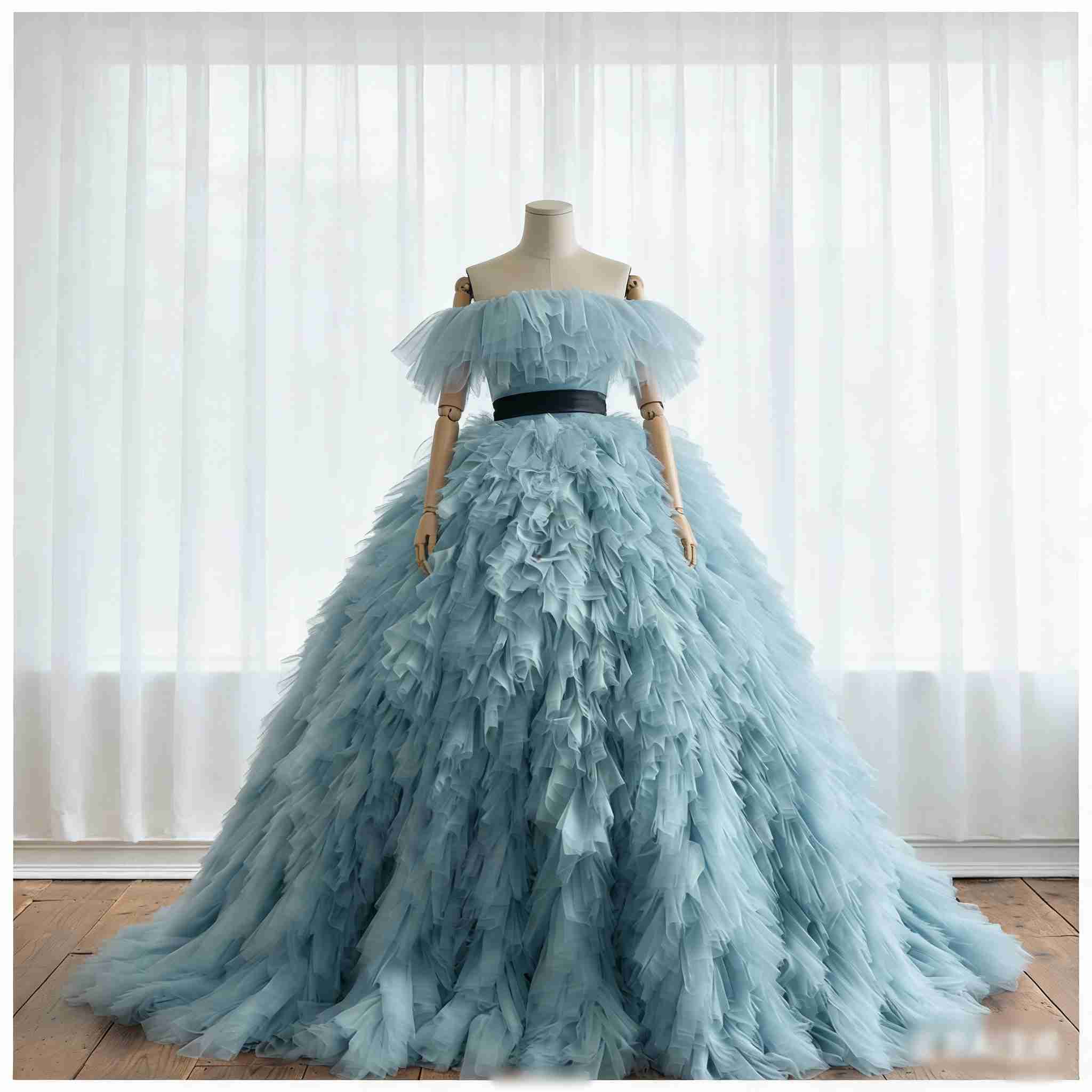 カラードレス オフショルダー 爽やかで優しいブルー もこもこドレス 披露宴 花嫁 抜群におしゃれ度が際立つ