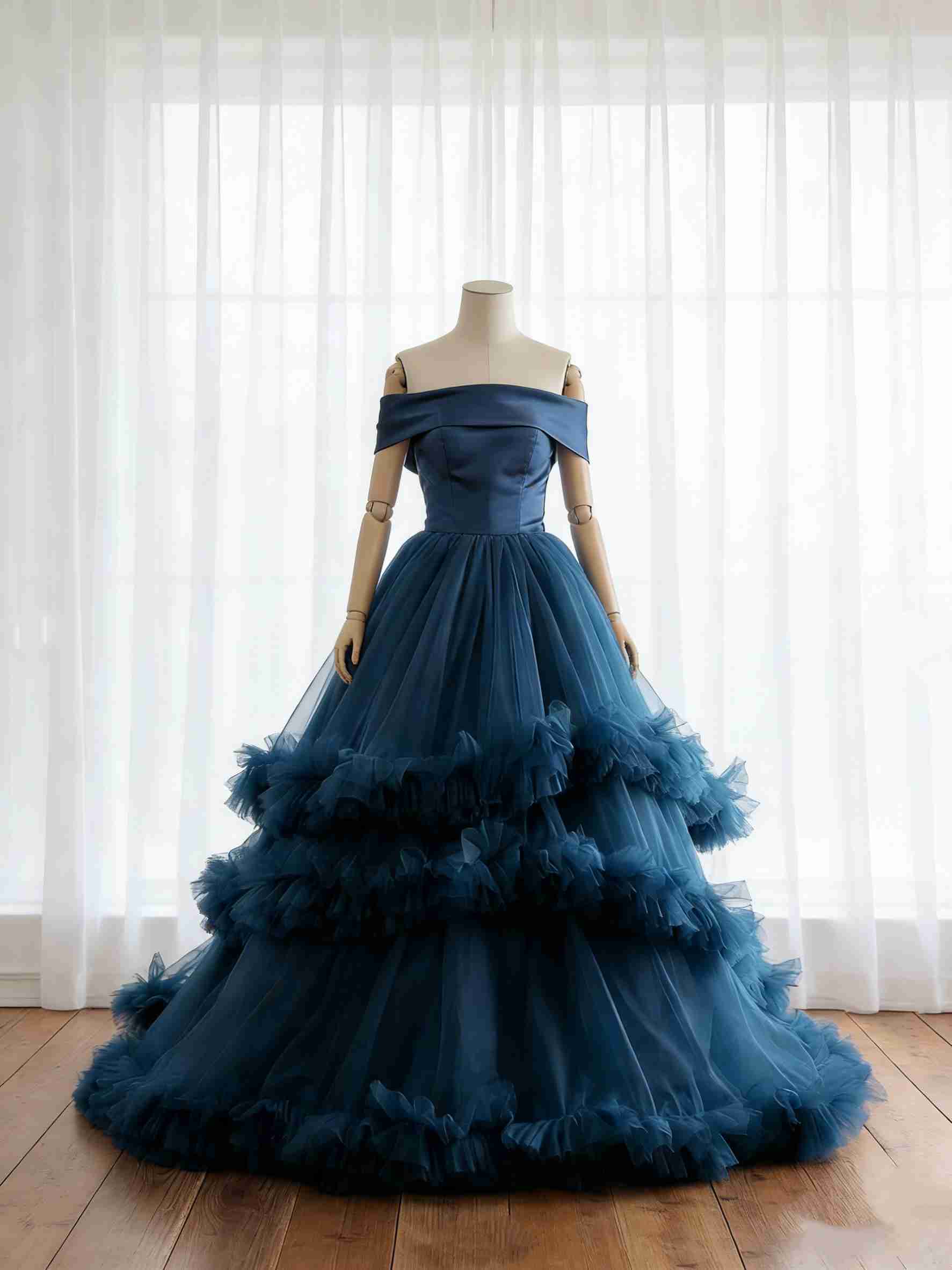 カラードレス ネイビー オフショルダー リボントレーン チュールスカート 結婚式 エレガント
