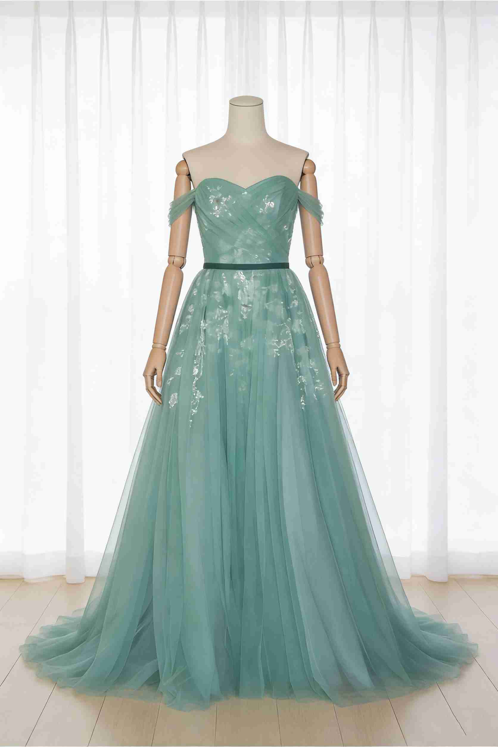 カラードレス グリーン オフショルダー キラキラ光る刺繍 チュールスカート ハンドドレープ 前撮り
