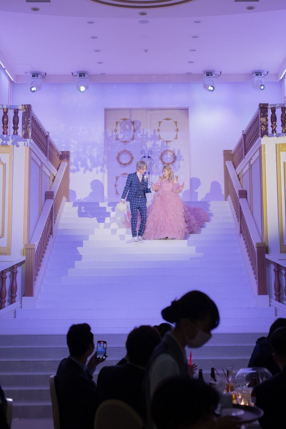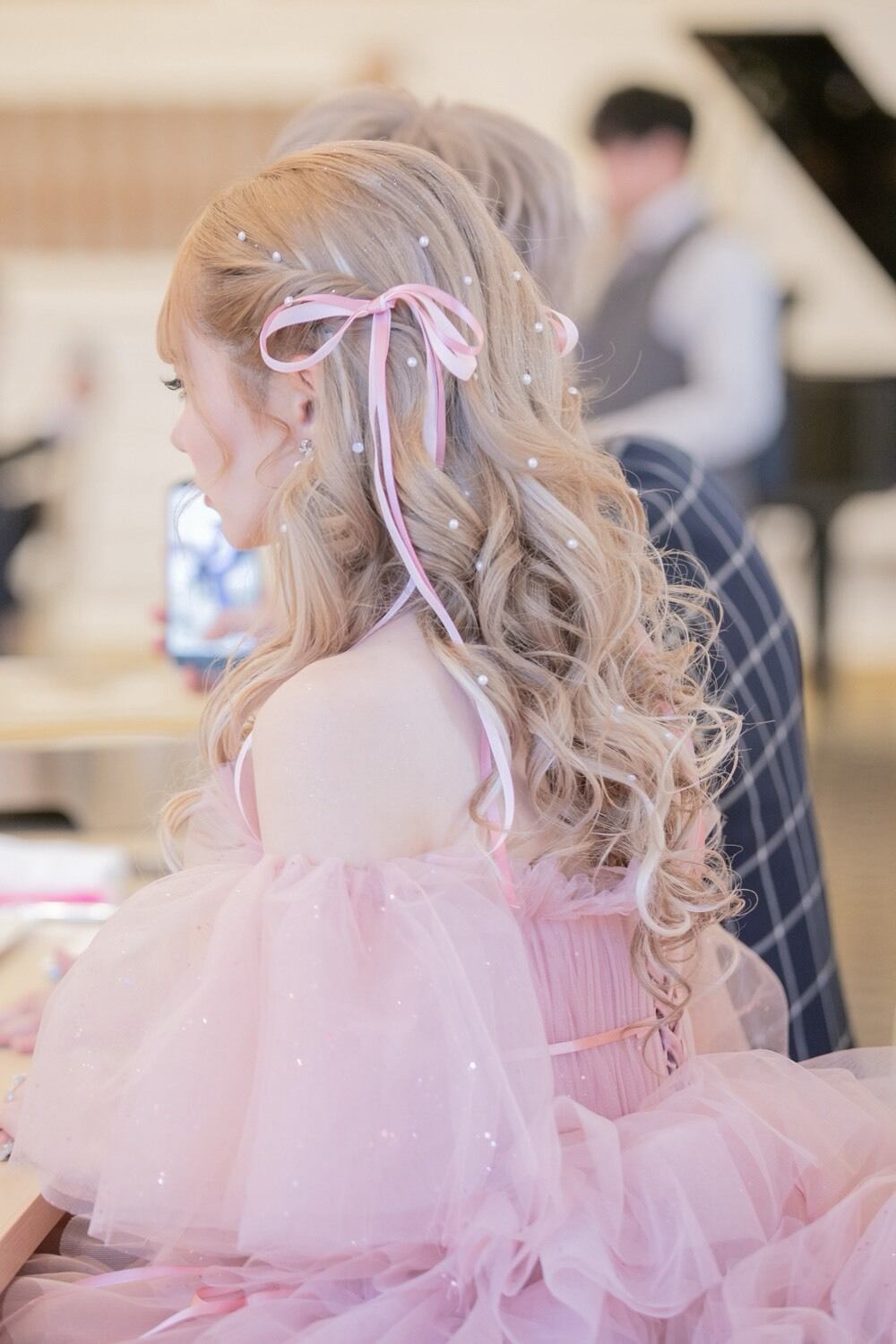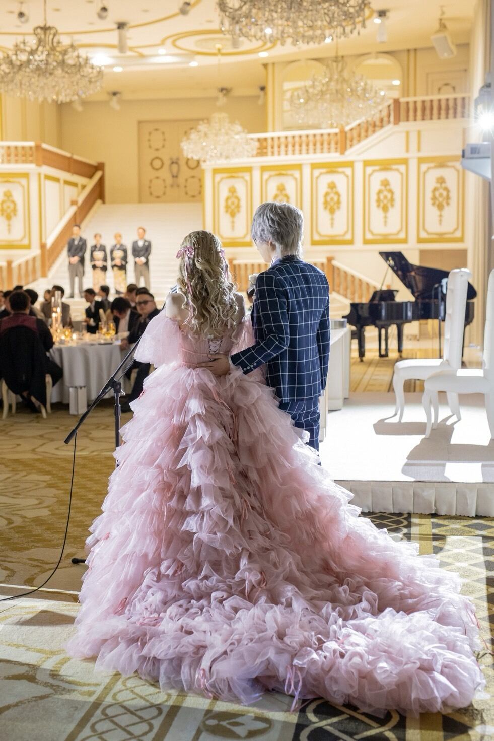 実例写真!カラードレス ピンク フリル袖 ティアードのドレス プリンセスライン 前撮り 結婚式 キラキラチュール 花嫁