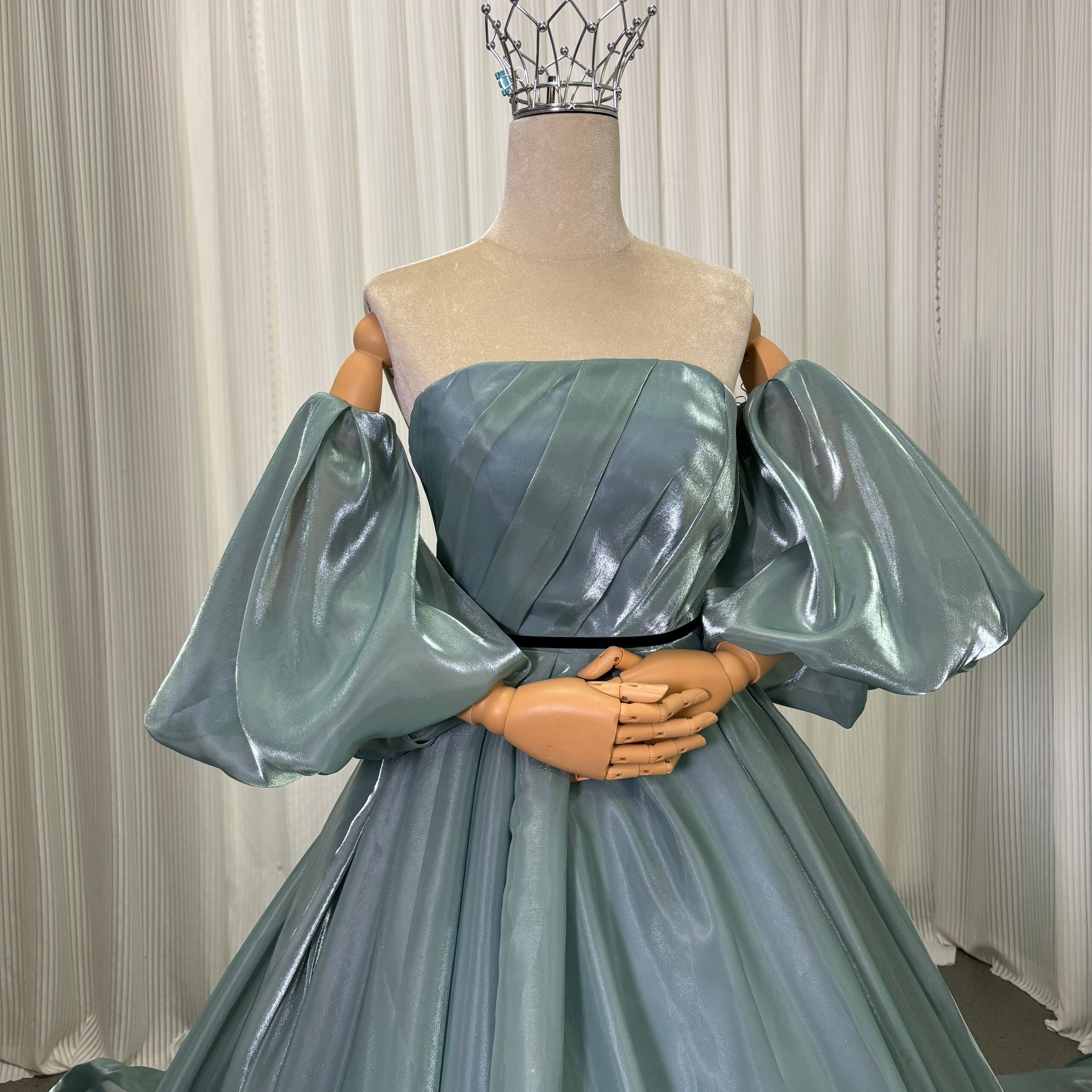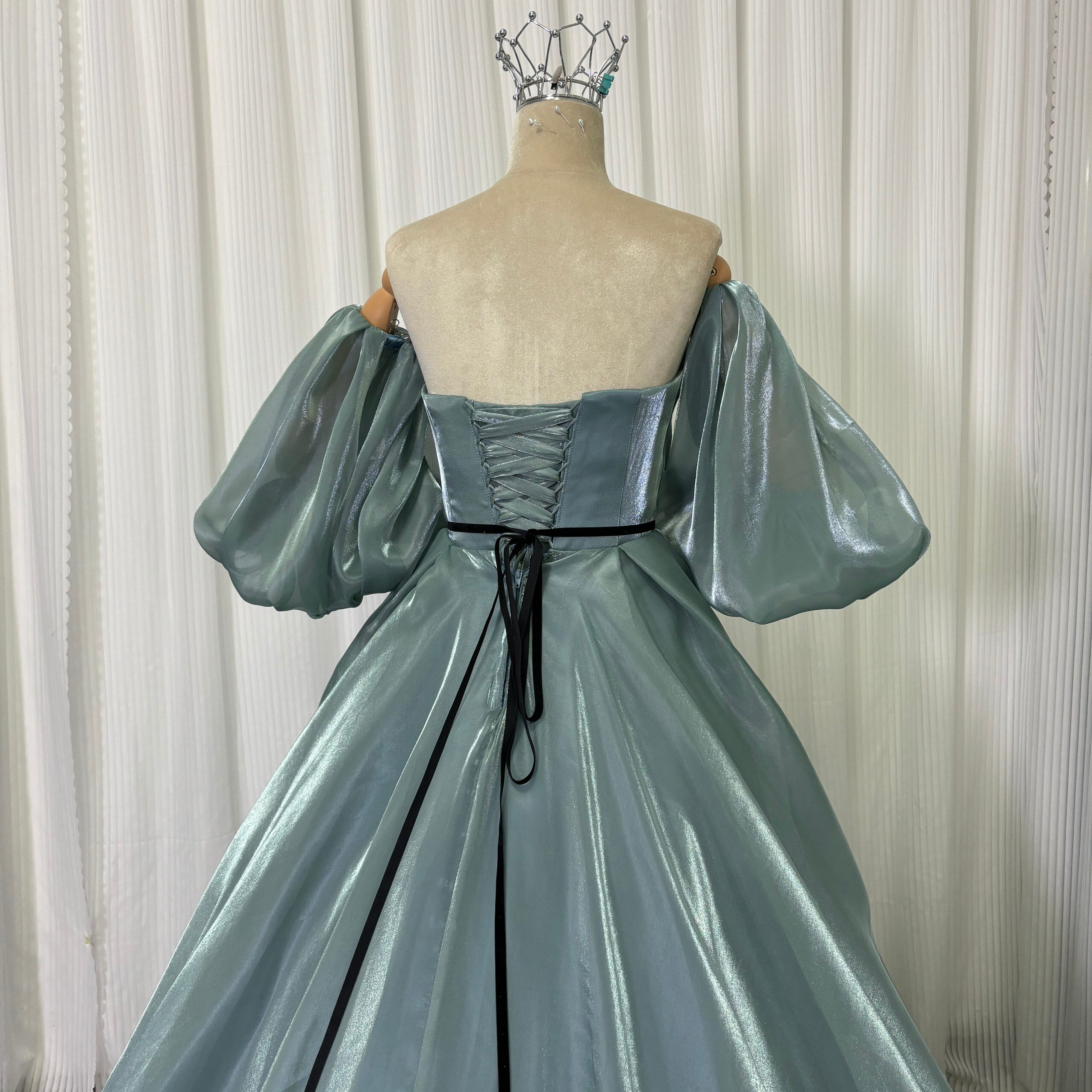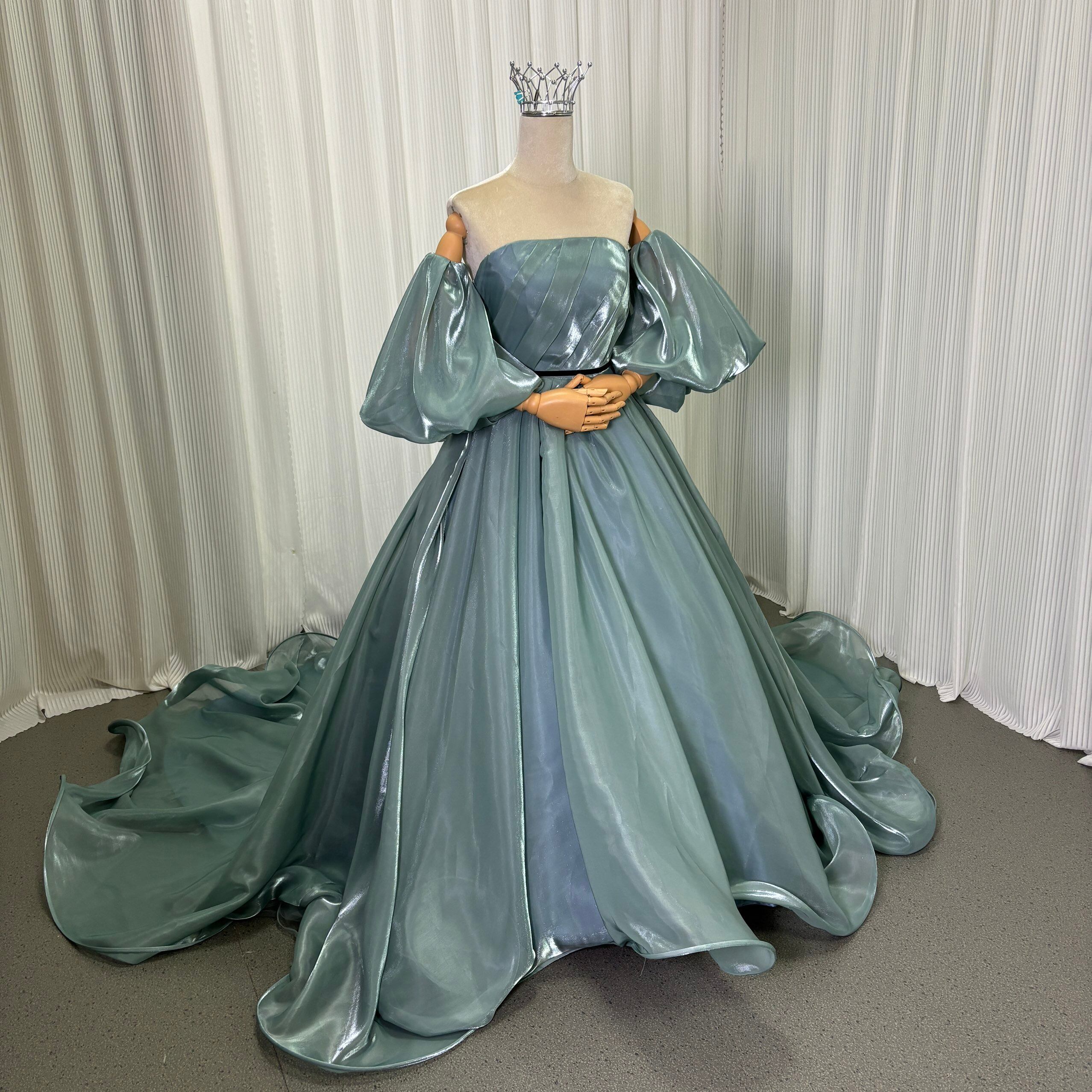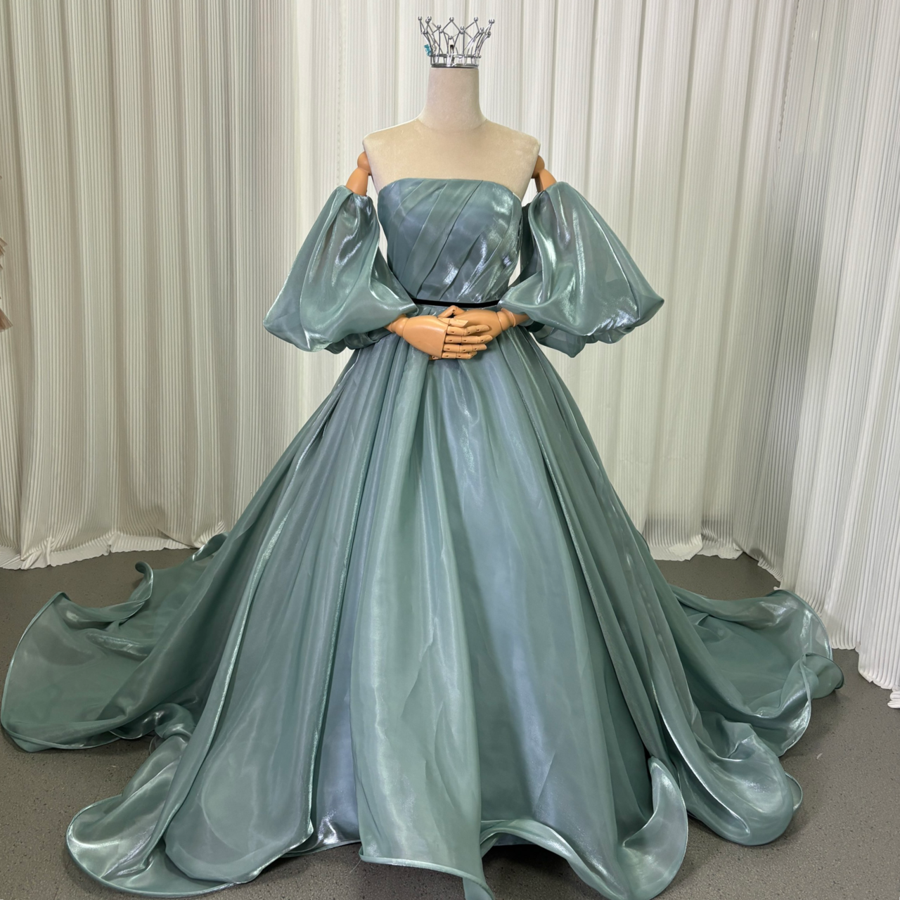 カラードレス パフスリーブドレス サッシュベルト ベアトップ ハンドドレープ グリーン リボントレーン 前撮り
