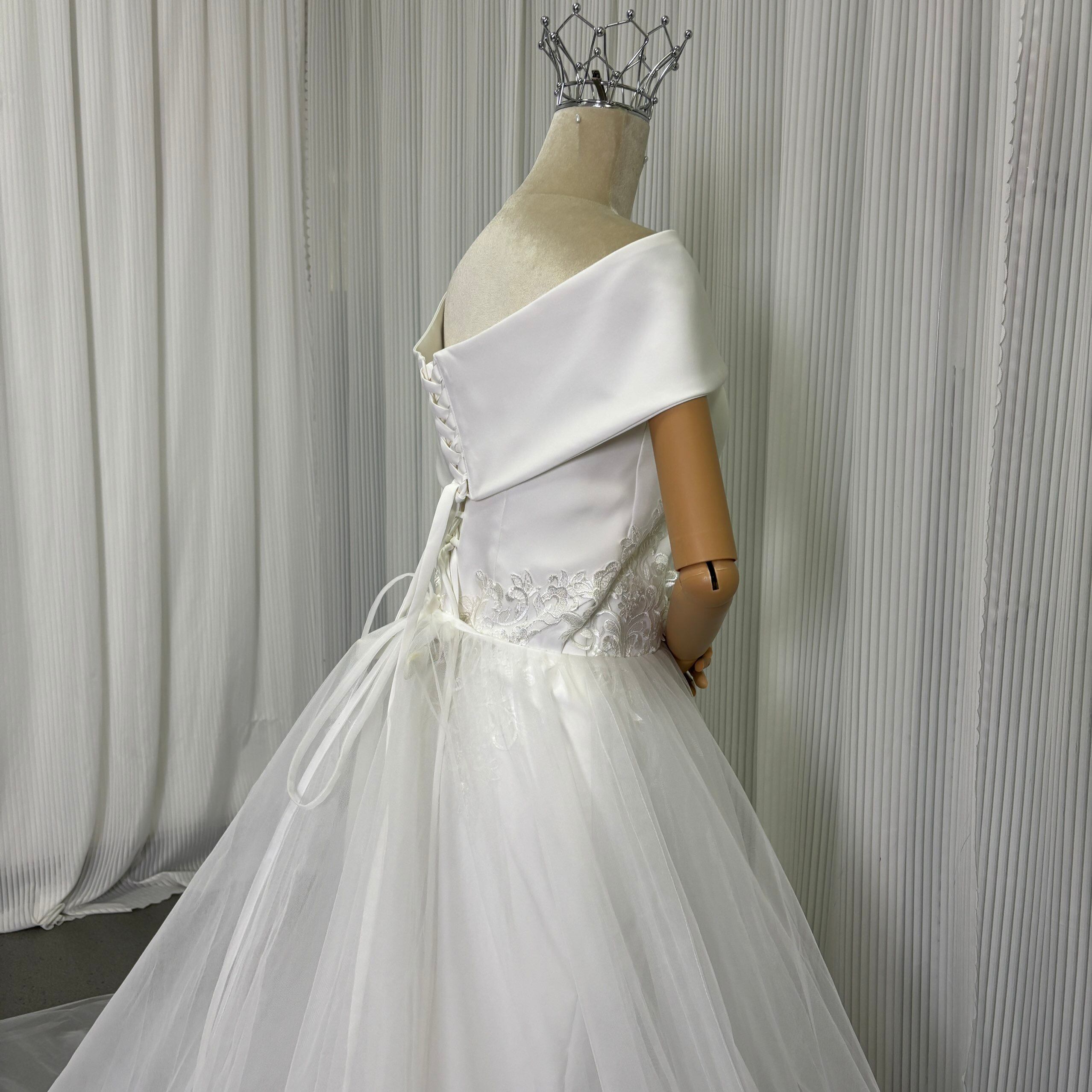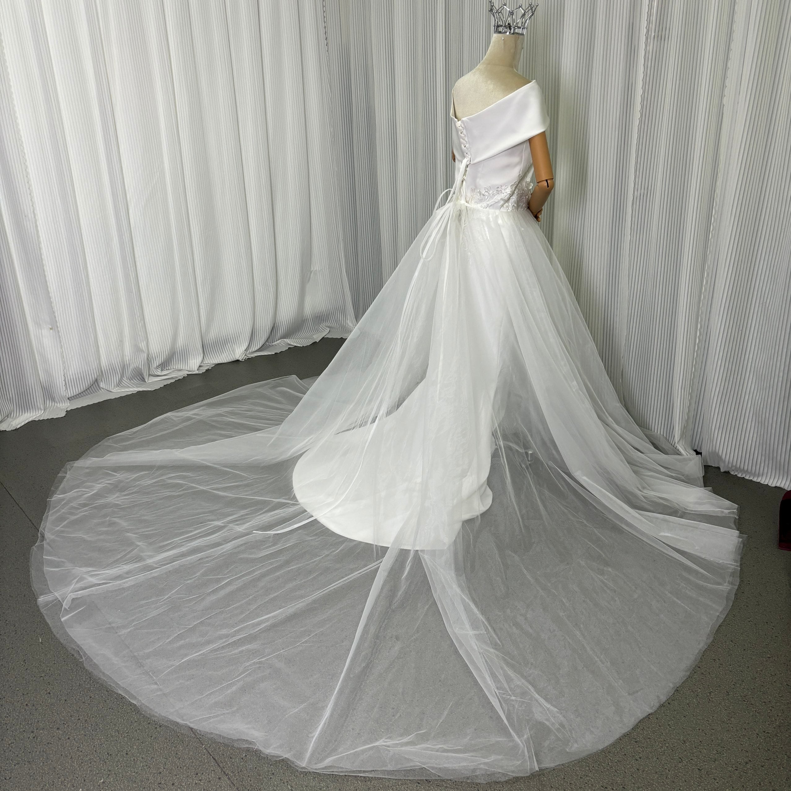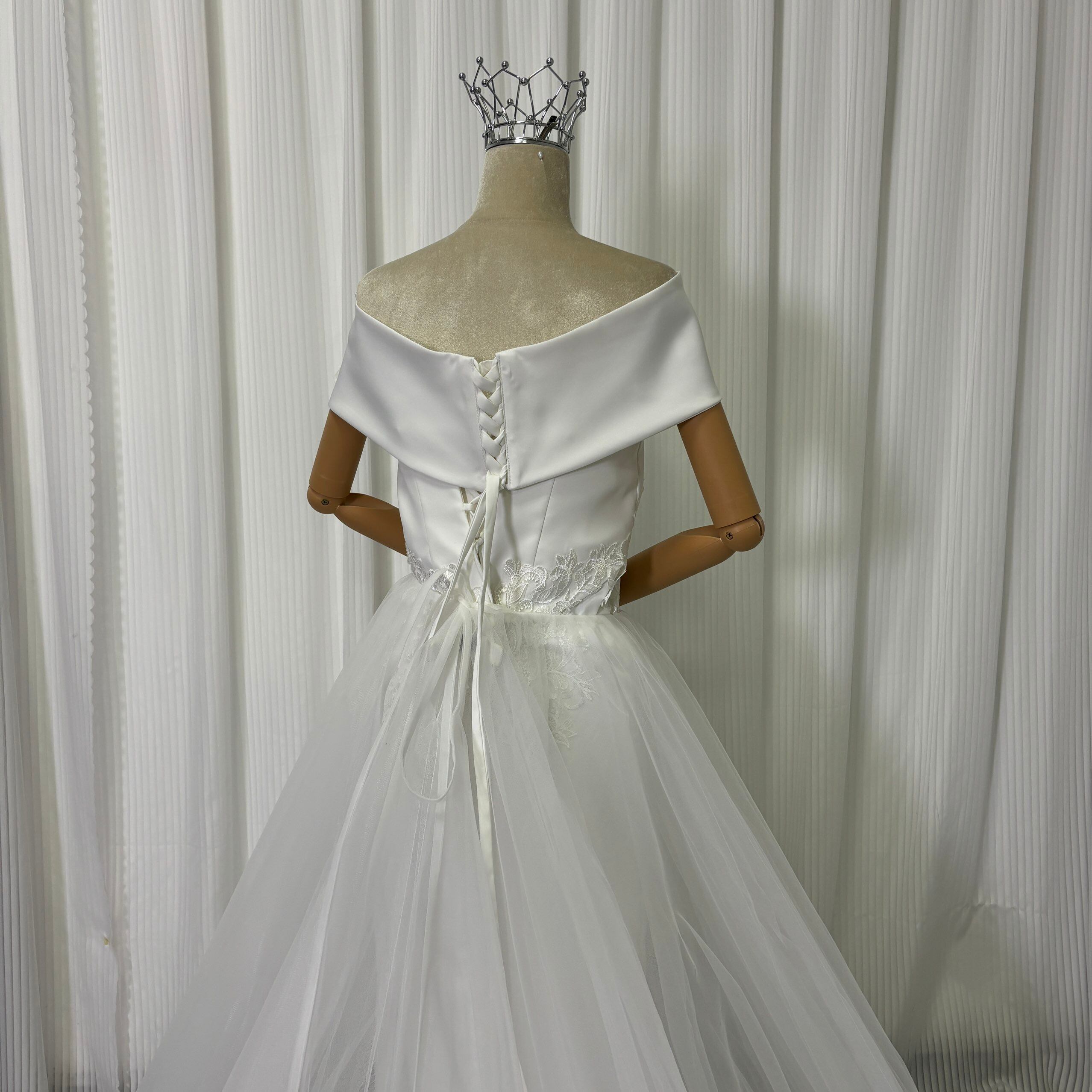 ウエディングドレス オフショルダー 編み上げ オーバースカート クレープ生地 マーメイドライン 上品な花レース