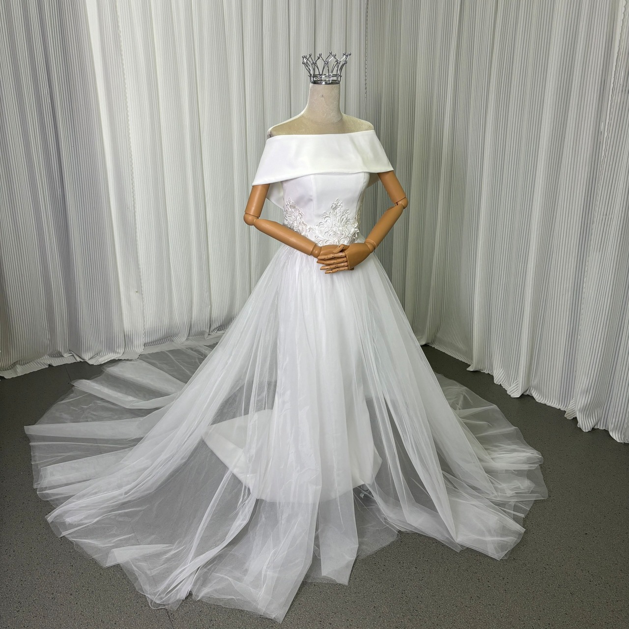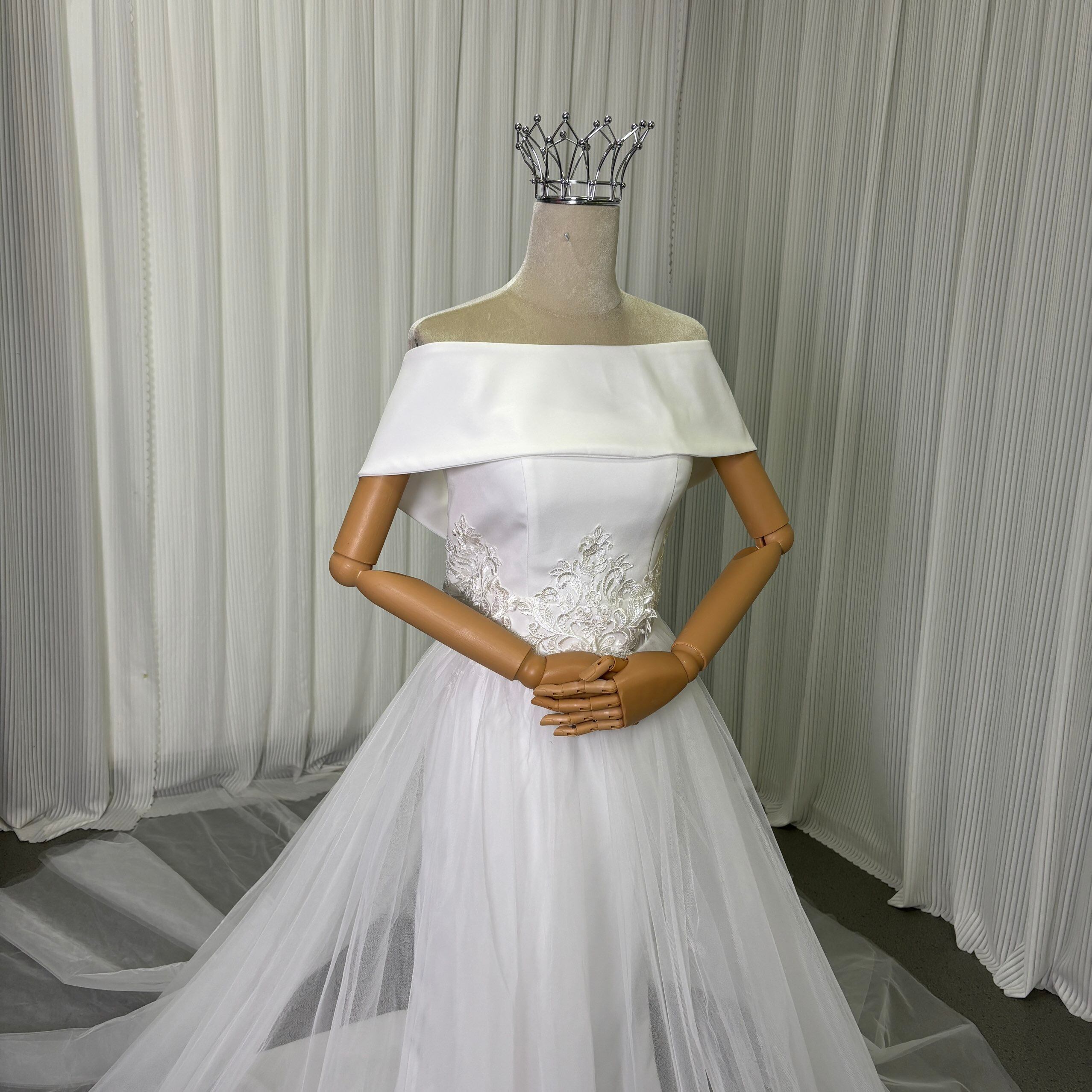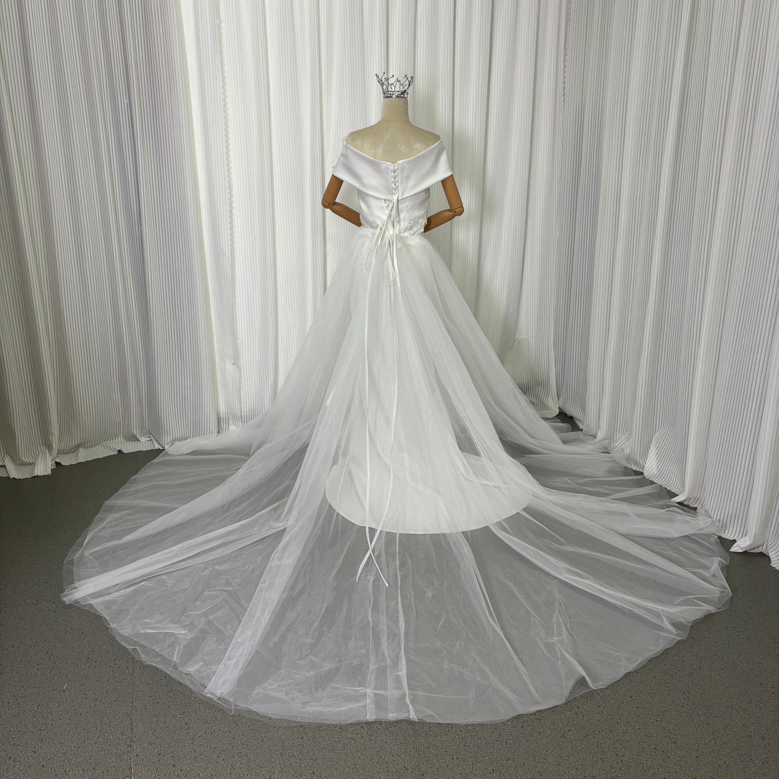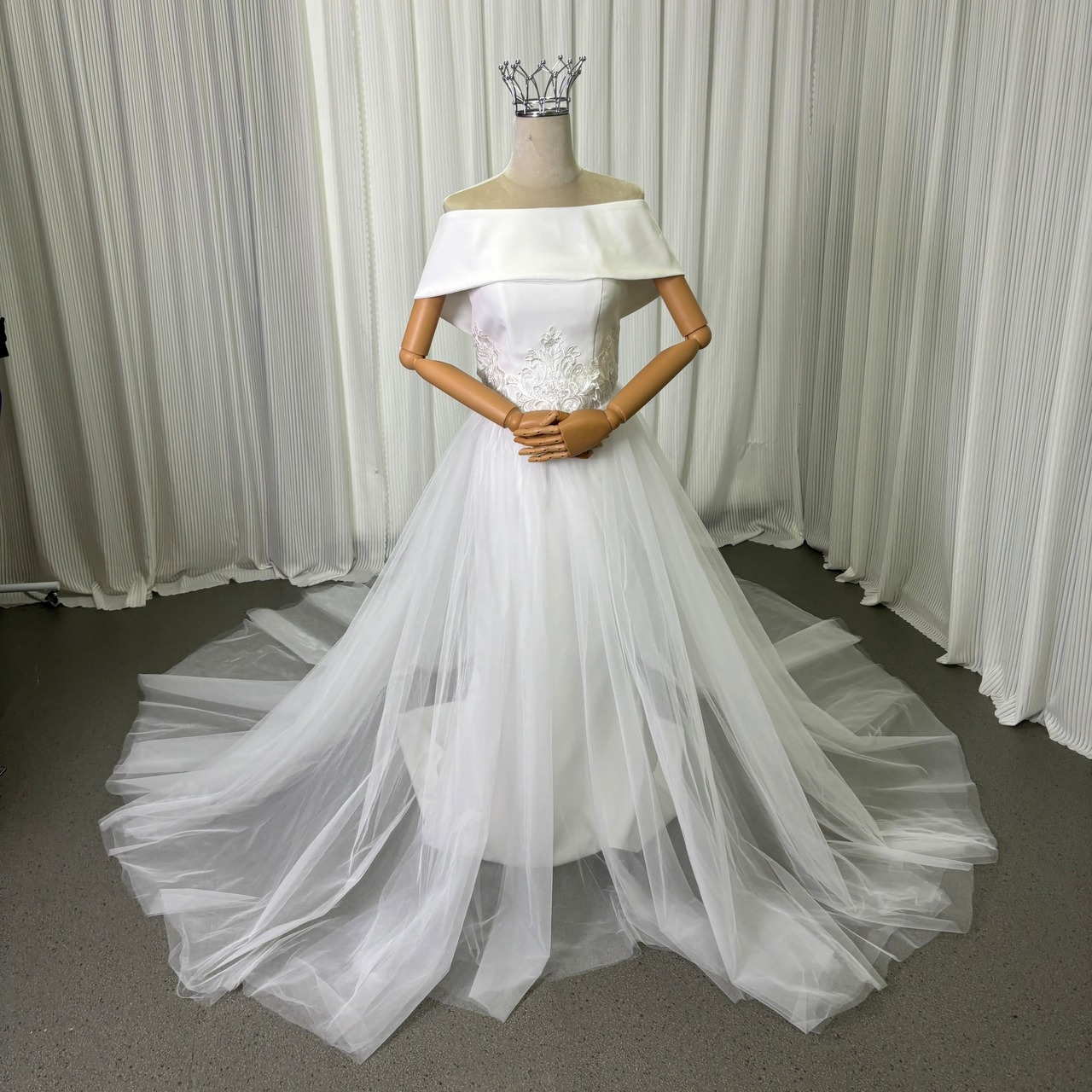 ウエディングドレス オフショルダー 編み上げ オーバースカート クレープ生地 マーメイドライン 上品な花レース