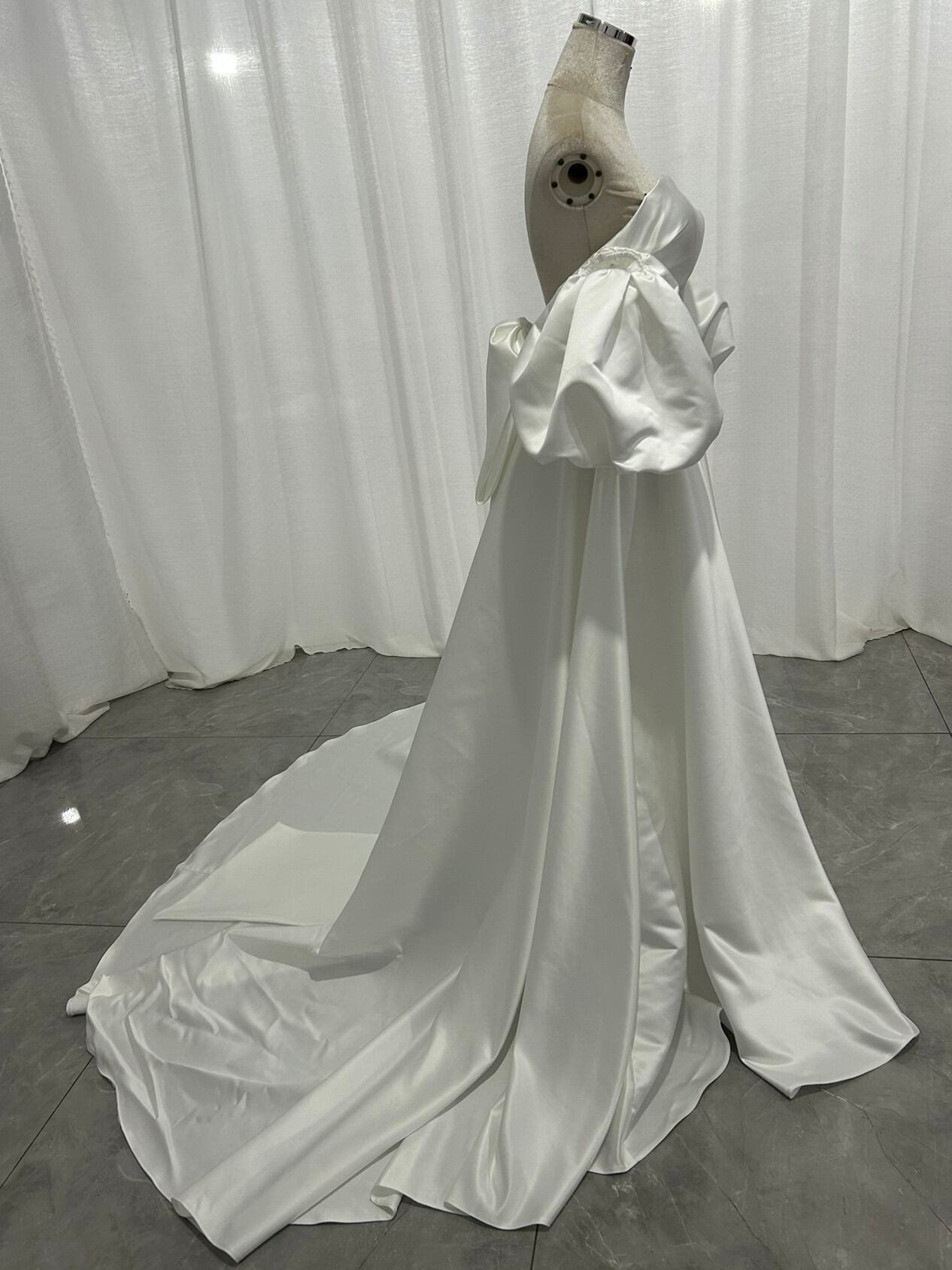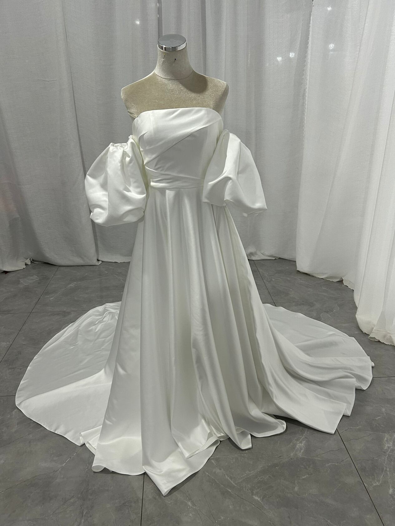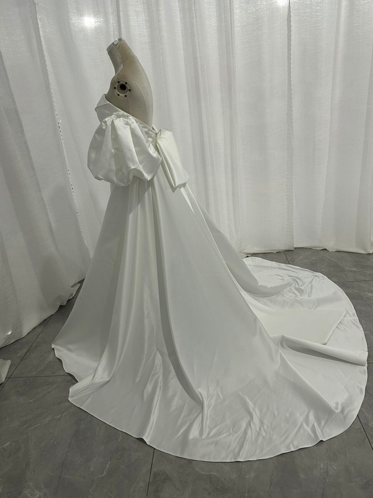 ウエディングドレス パフスリーブドレス 光沢サテン ハンドドレープ ロングトレーン オフホワイト 前撮り