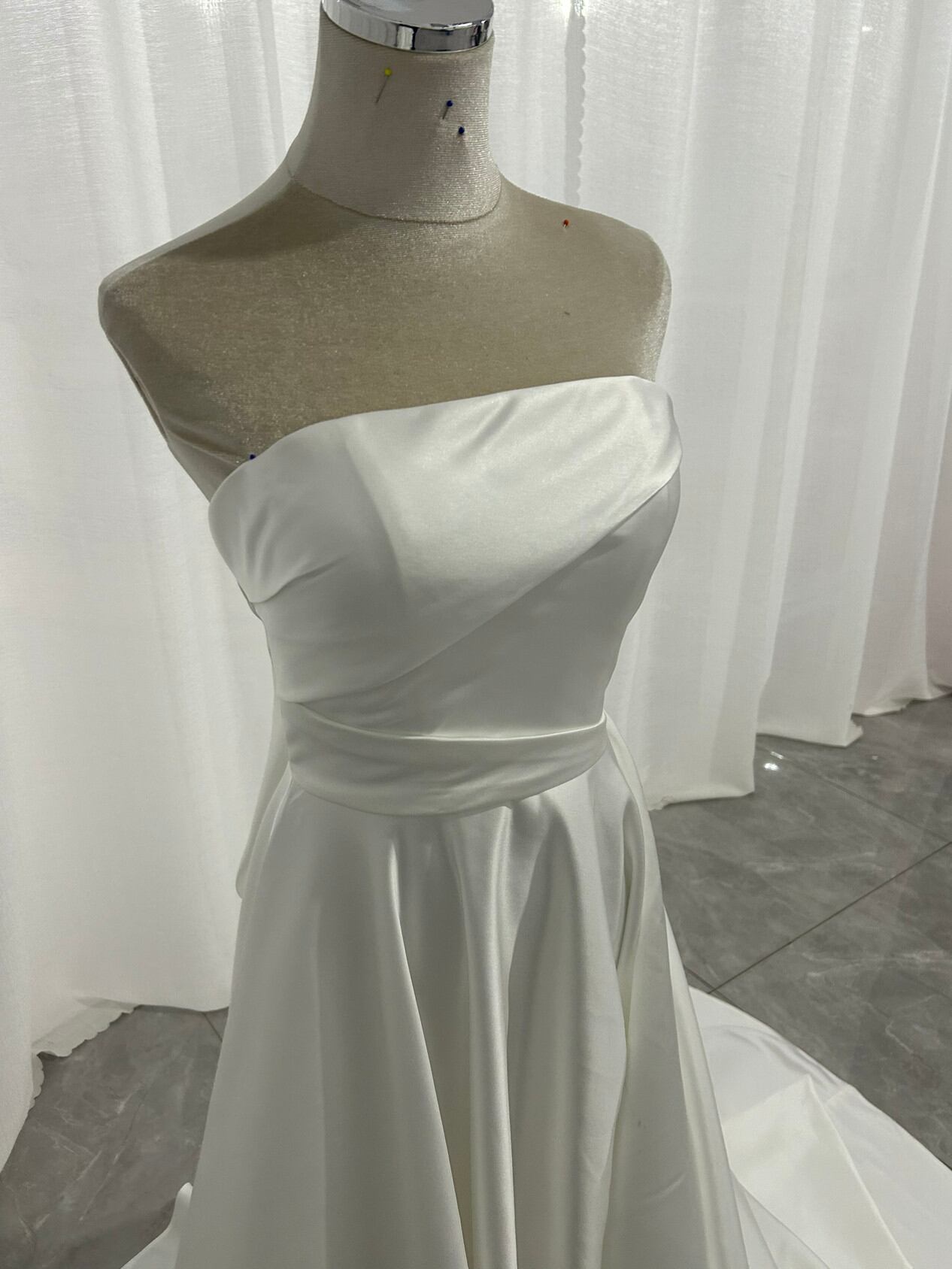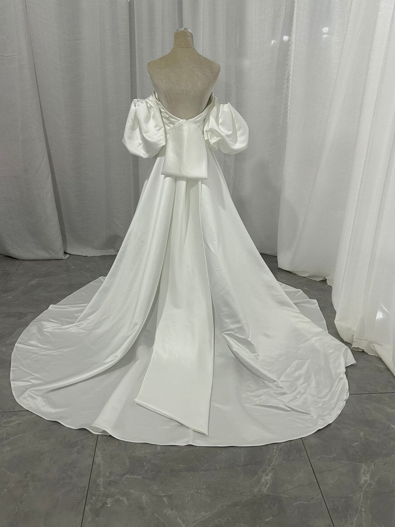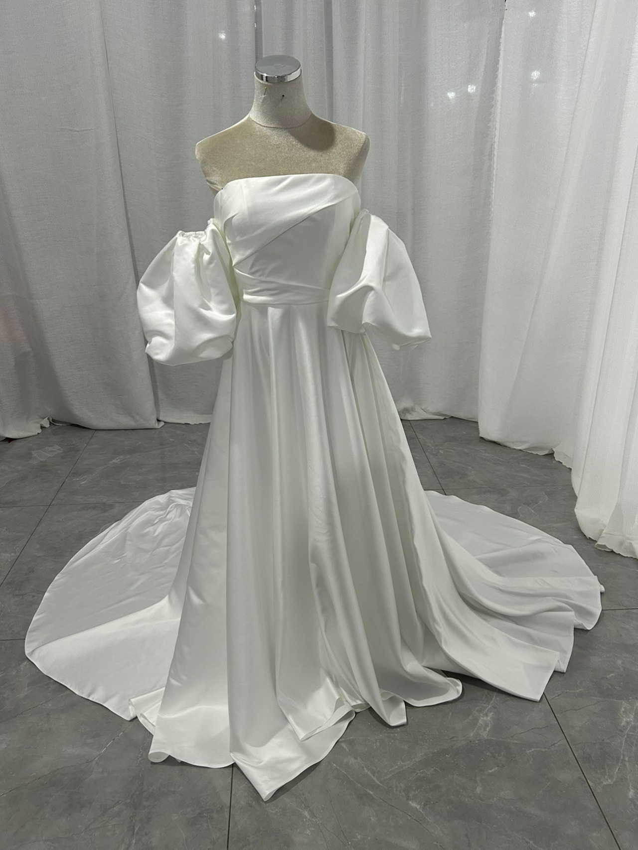 ウエディングドレス パフスリーブドレス 光沢サテン ハンドドレープ ロングトレーン オフホワイト 前撮り