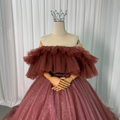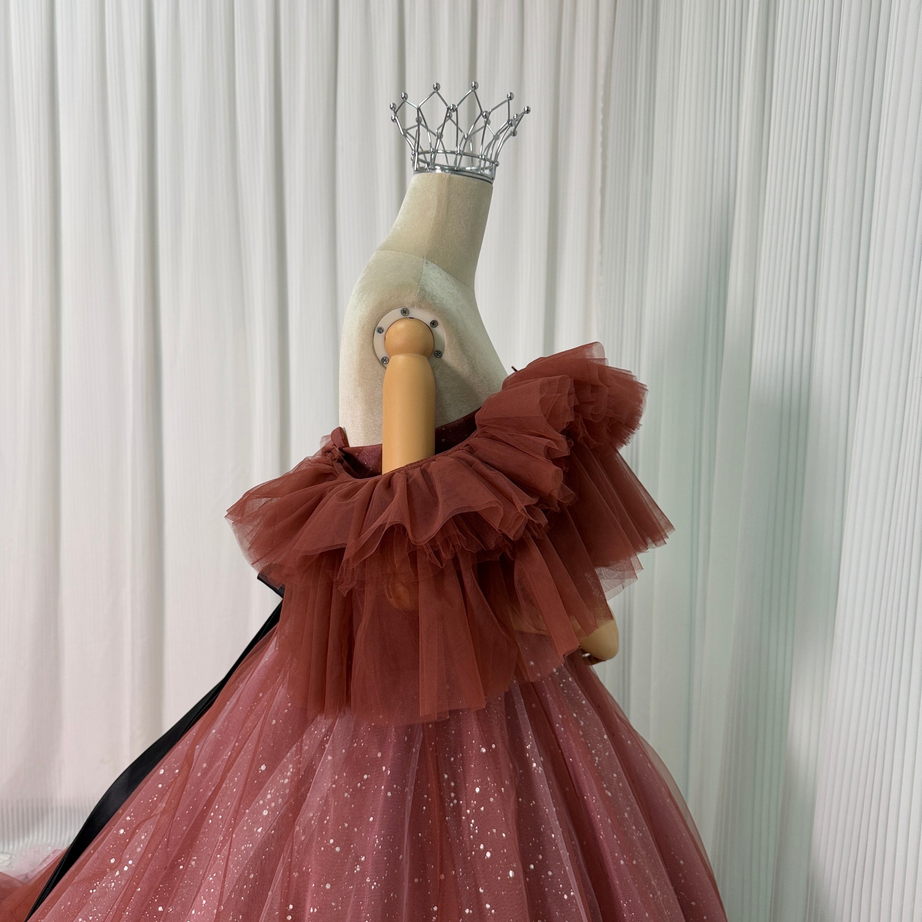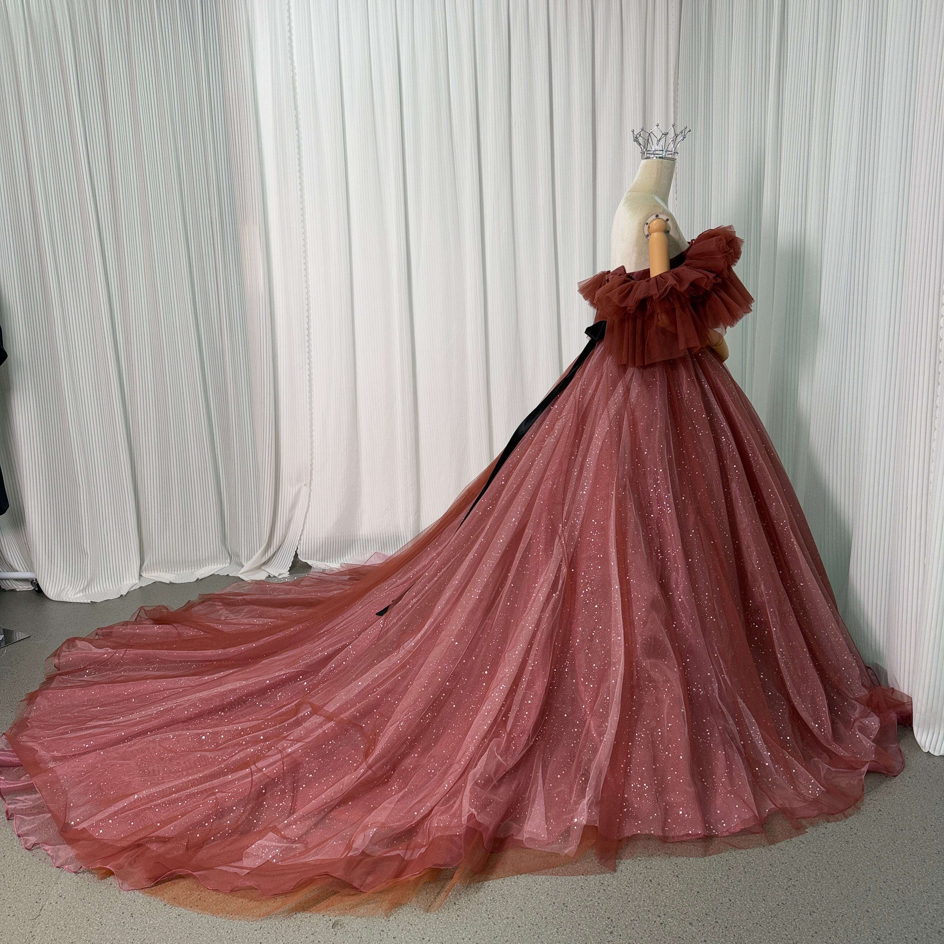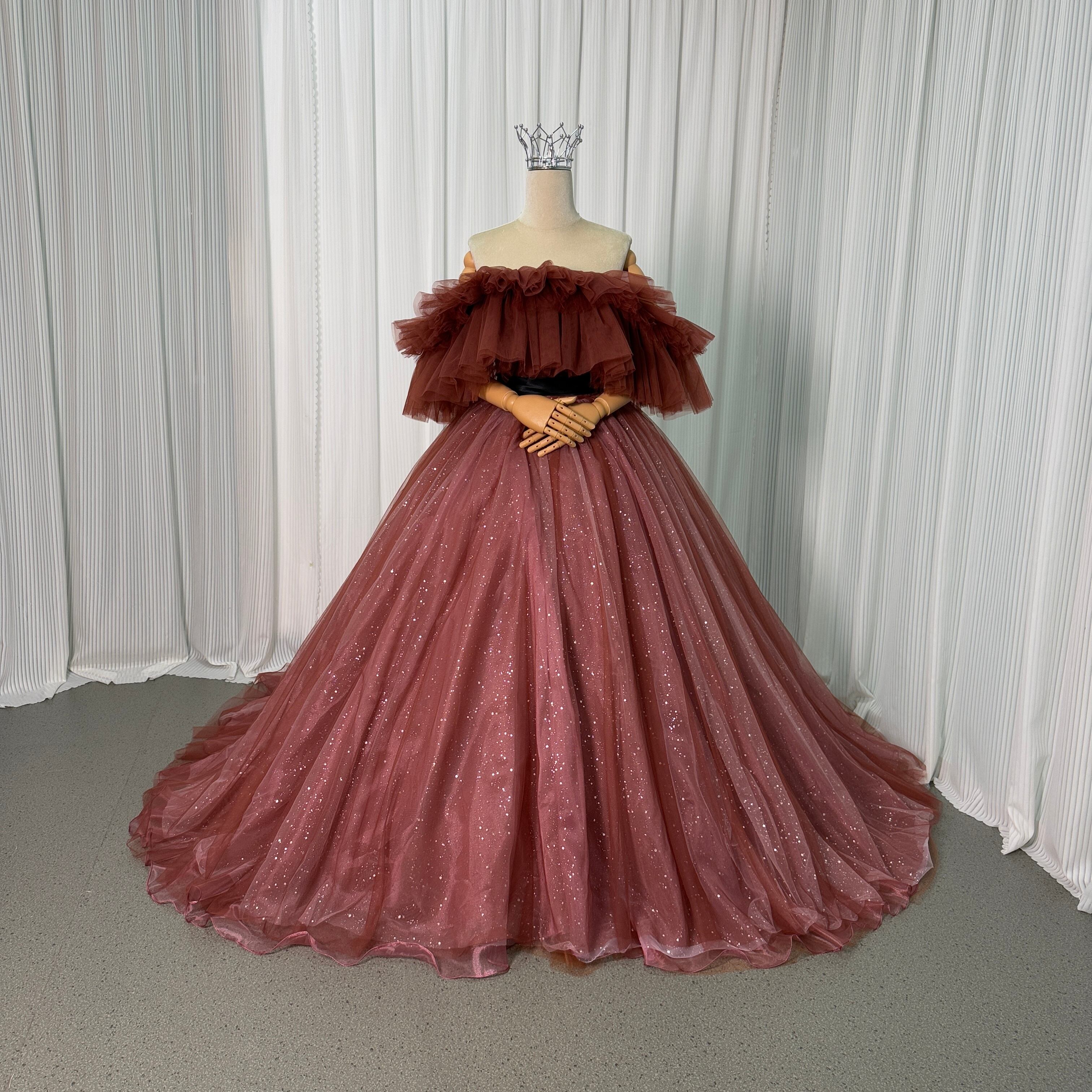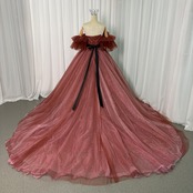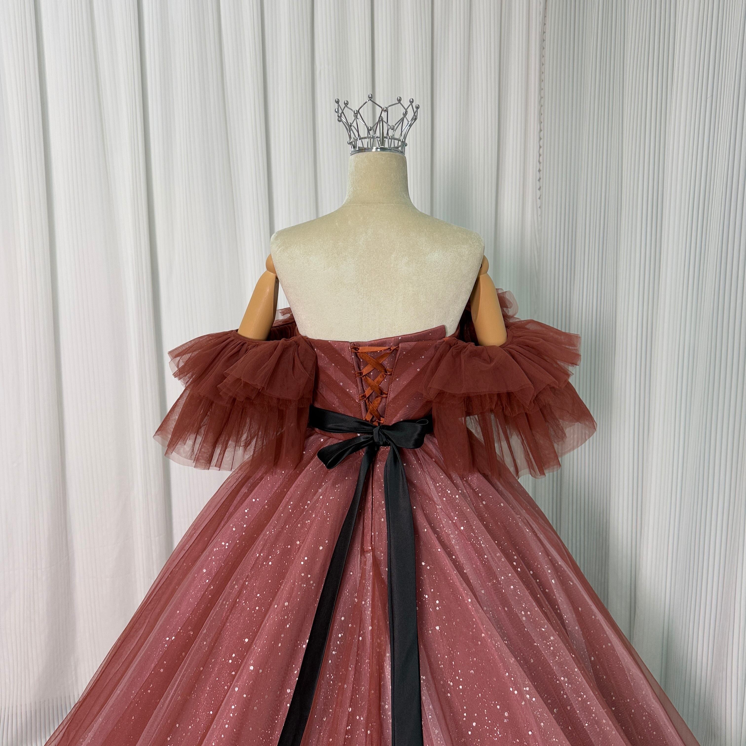 カラードレス 取り外し可能なオフショルダー テラコッタ色 キラキラグリッターチュール ベルト 編み上げ 結婚式