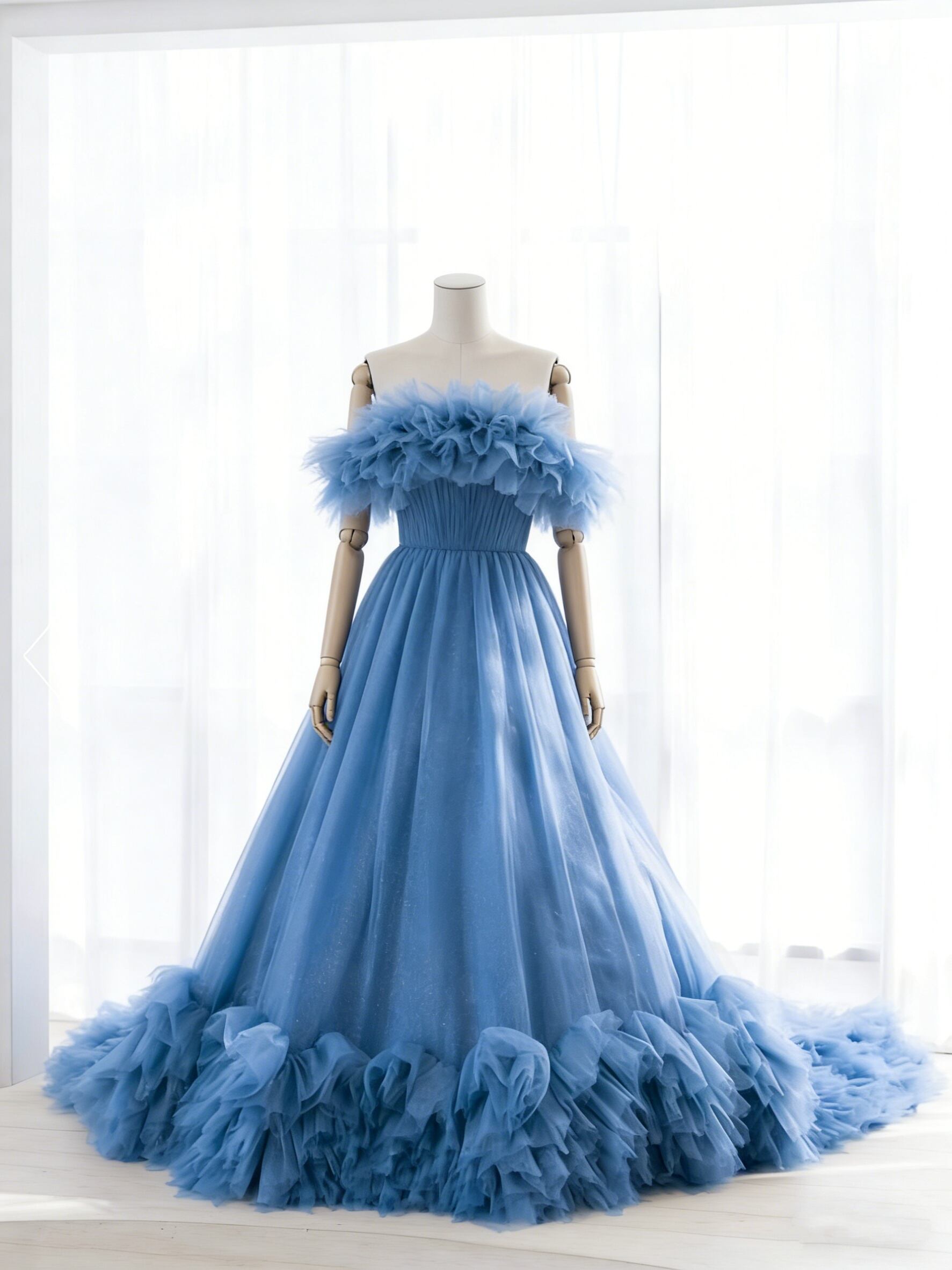 カラードレス ブルーグレー 取り外し可能なオフショルダー リボントレーン キラキラドレス 結婚式 エレガント