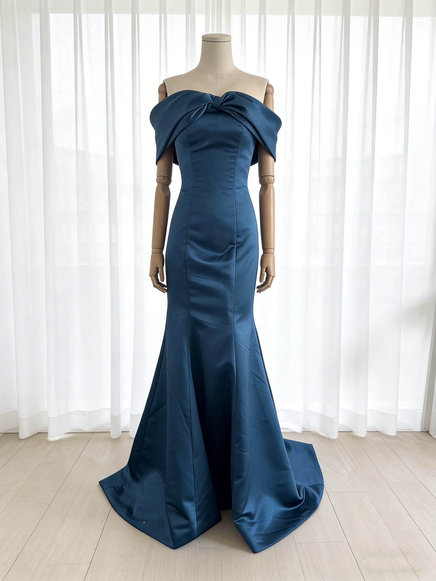 パーティードレス ネイビー オフショルダー マーメイドライン 光沢サテン 前撮り 優雅なシルエット