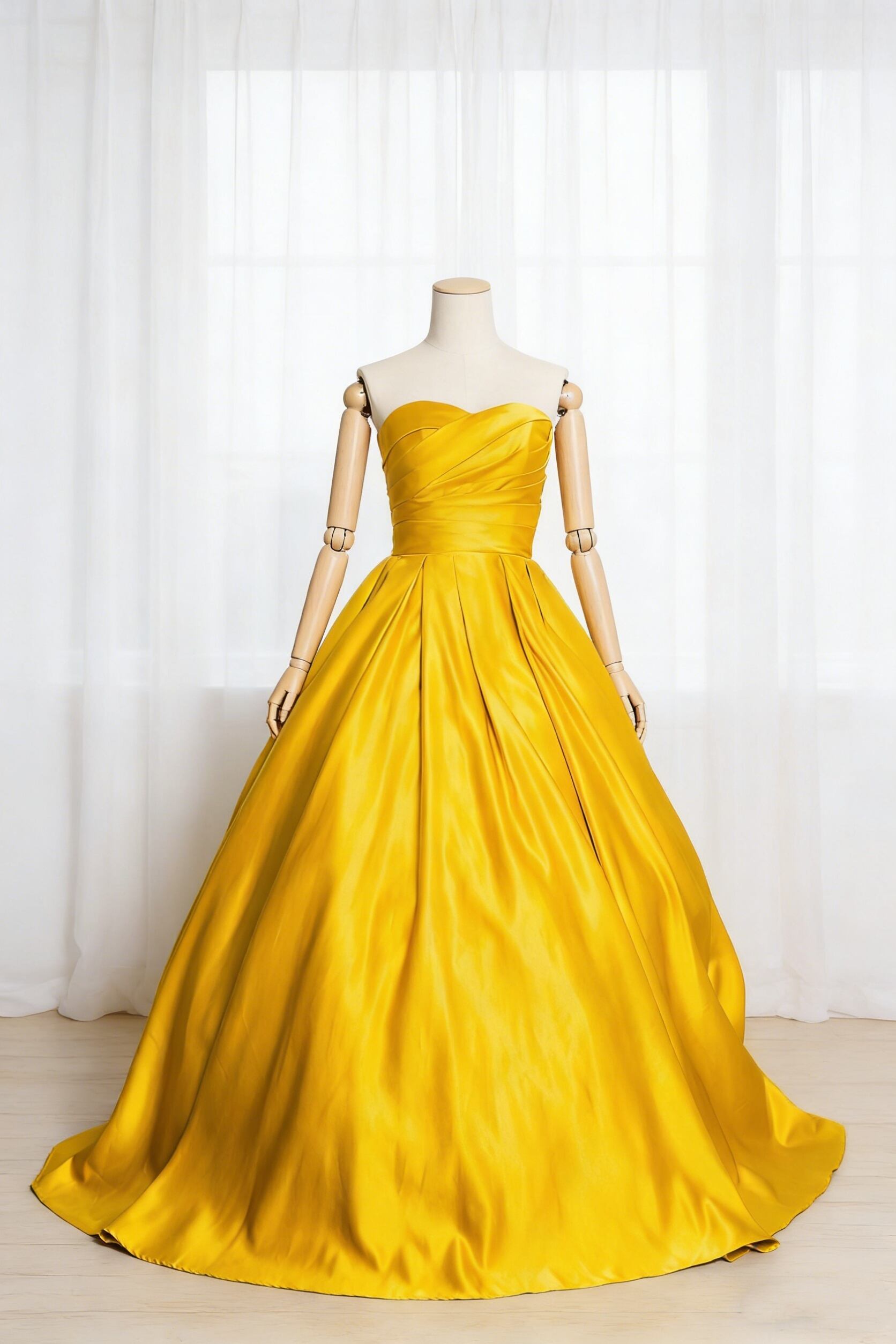 カラードレス イエロー ベアトップ 光沢サテン 前撮り スレンダーライン ロングドレス オーダーメイド可能