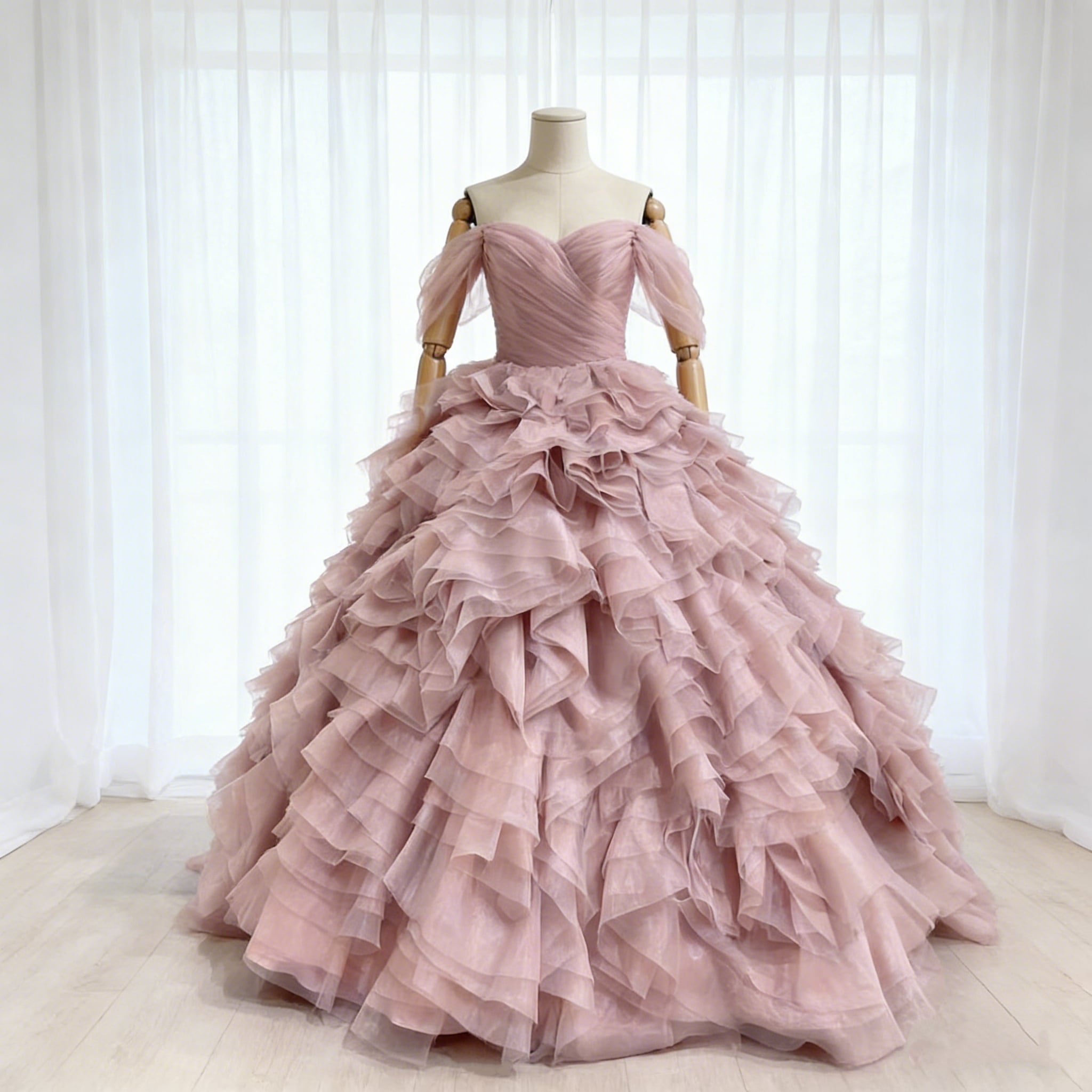 カラードレス ピンク オフショルダー もこもこドレス フレアスカート プリンセスライン ハンドドレープ 花嫁