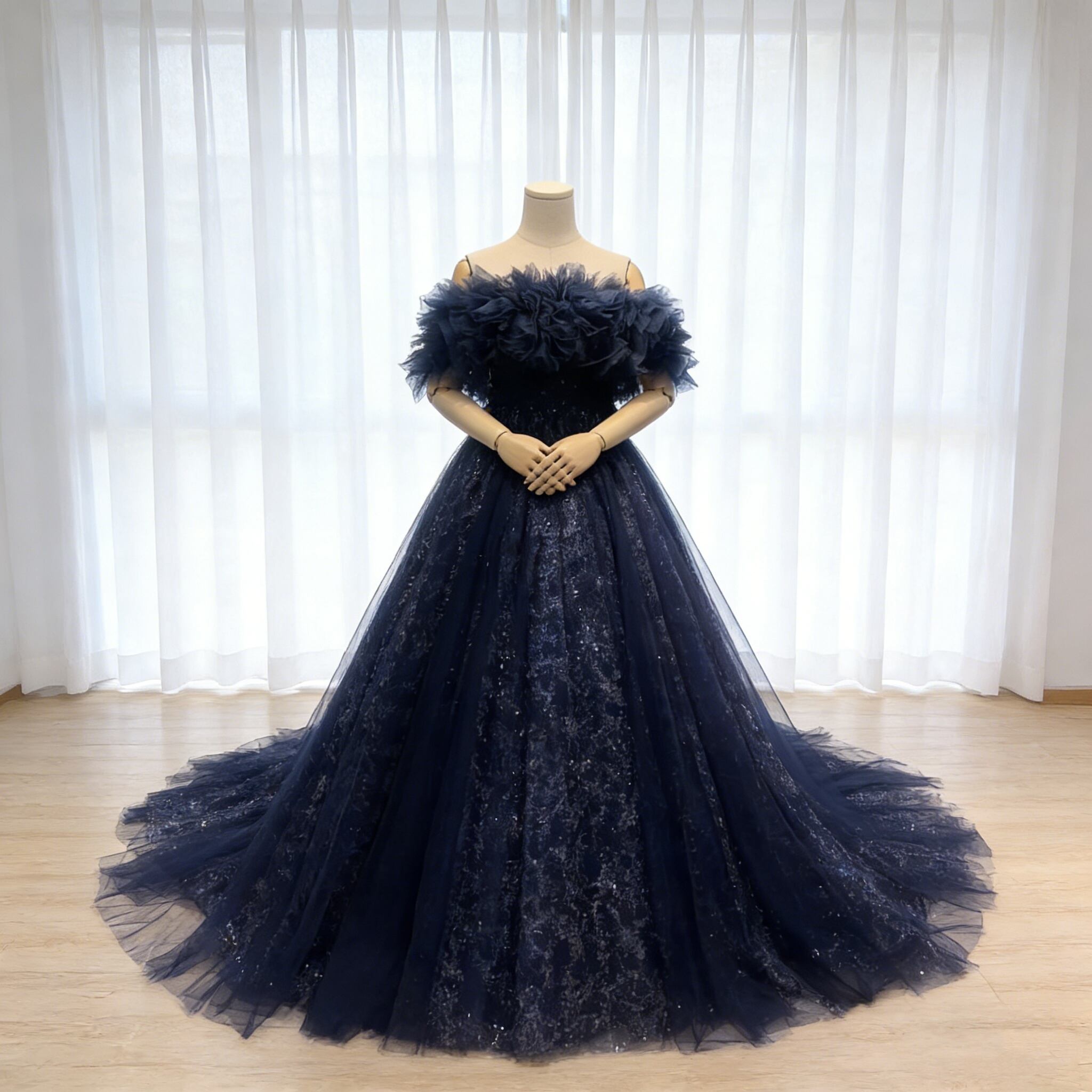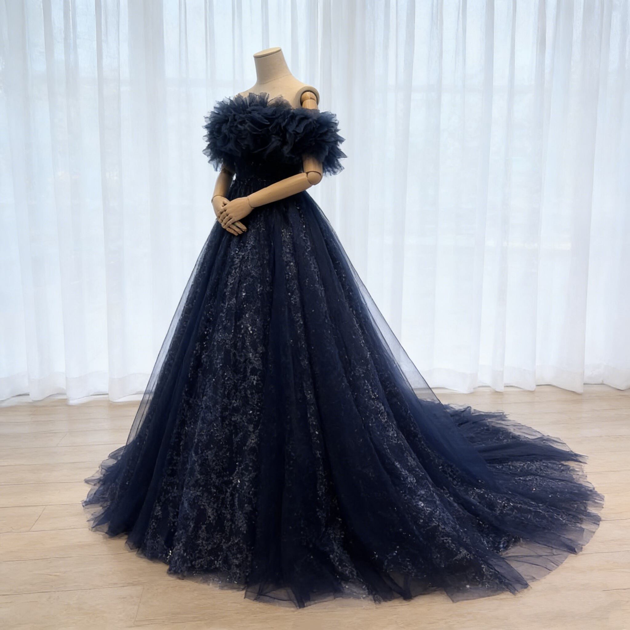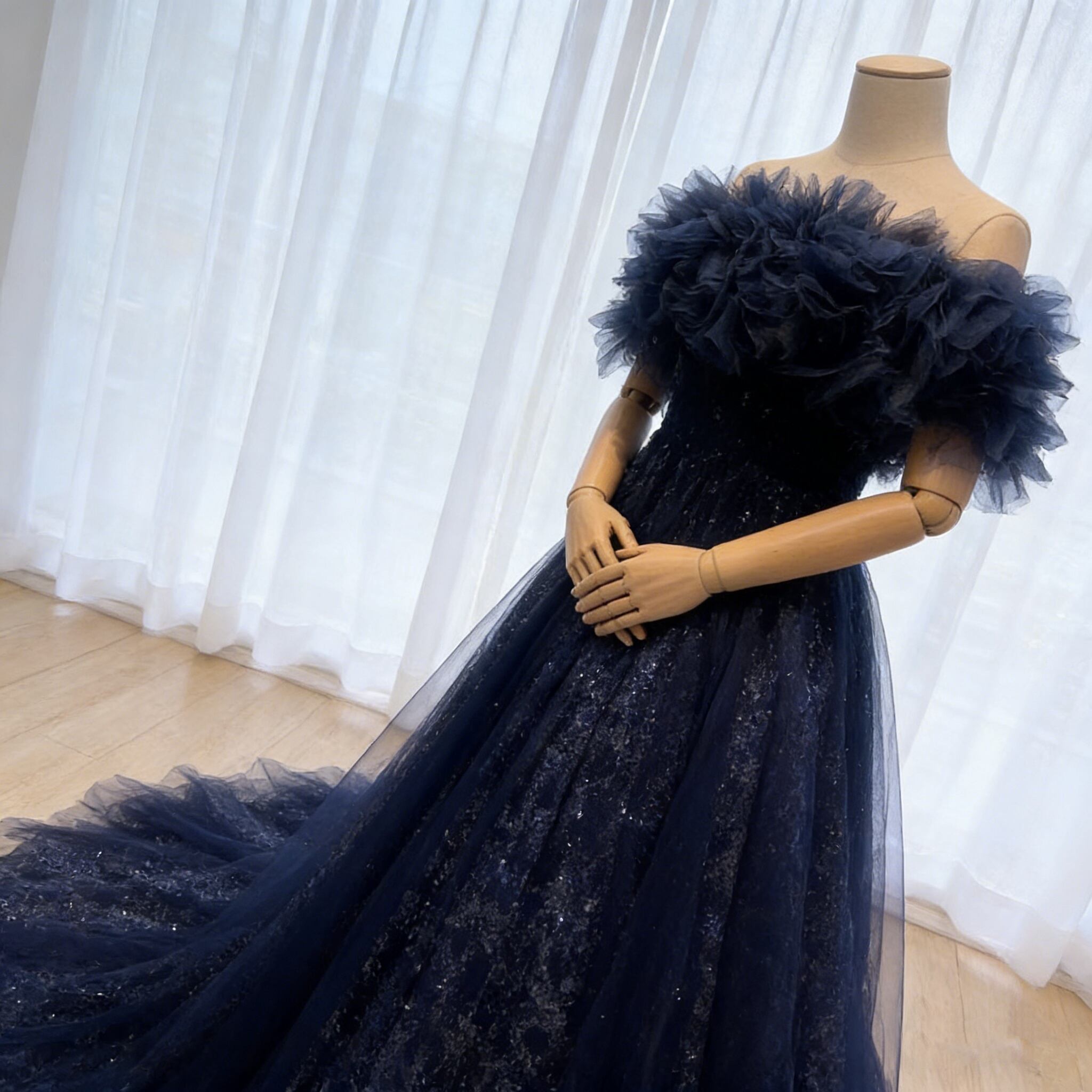 カラードレス 取り外し可能なオフショルダー キラキラチュール ネイビー エレガント ブライダル
