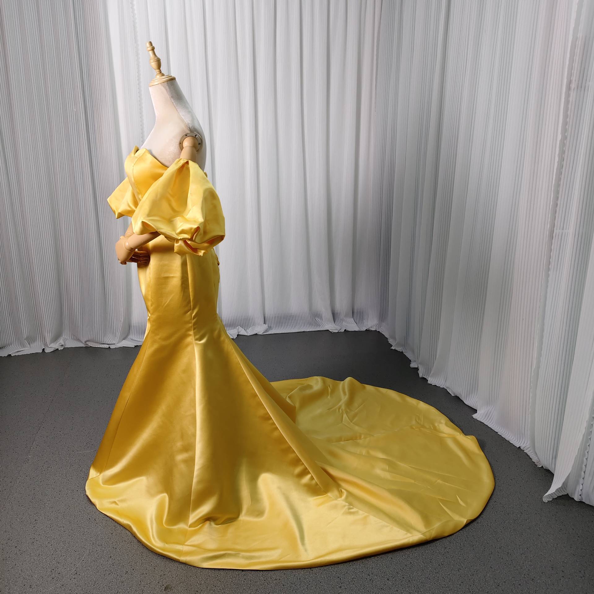パーティードレス カラードレス パフスリーブドレス 編み上げ マーメイドライン 光沢サテン 前撮り