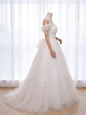 ウエディングドレス オフショルダー 柔らかく重ねたチュールスカート ハンドドレープ 細見えシルエット オフホワイト 前撮り