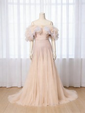 カラードレス 薄シャンパン色 オフショルダー ソフトマーメイドライン チュールスカート 前撮り 細見えシルエッ