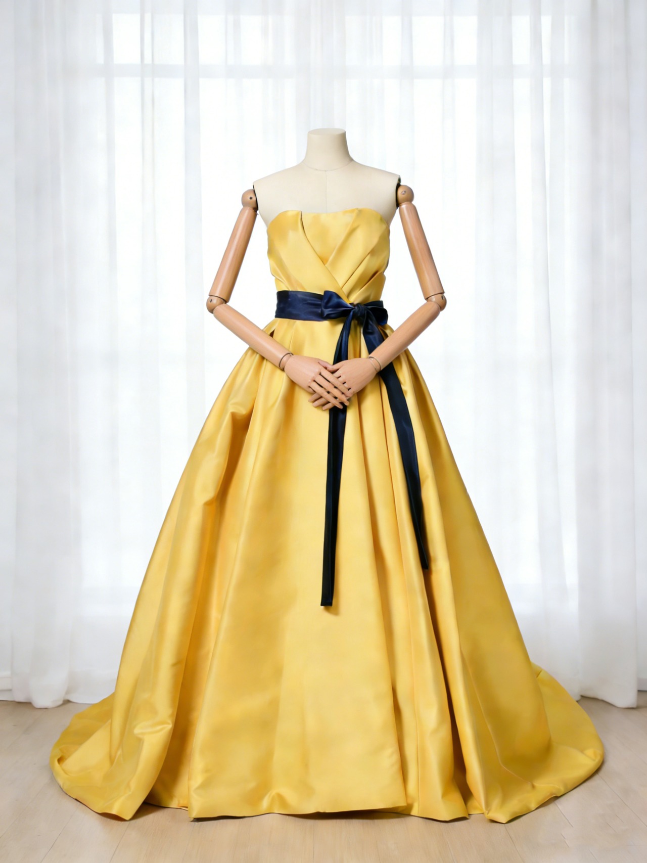 カラードレス イエロー サッシュベルト 光沢サテン 前撮り スレンダーライン Aライン パーティーワンピース