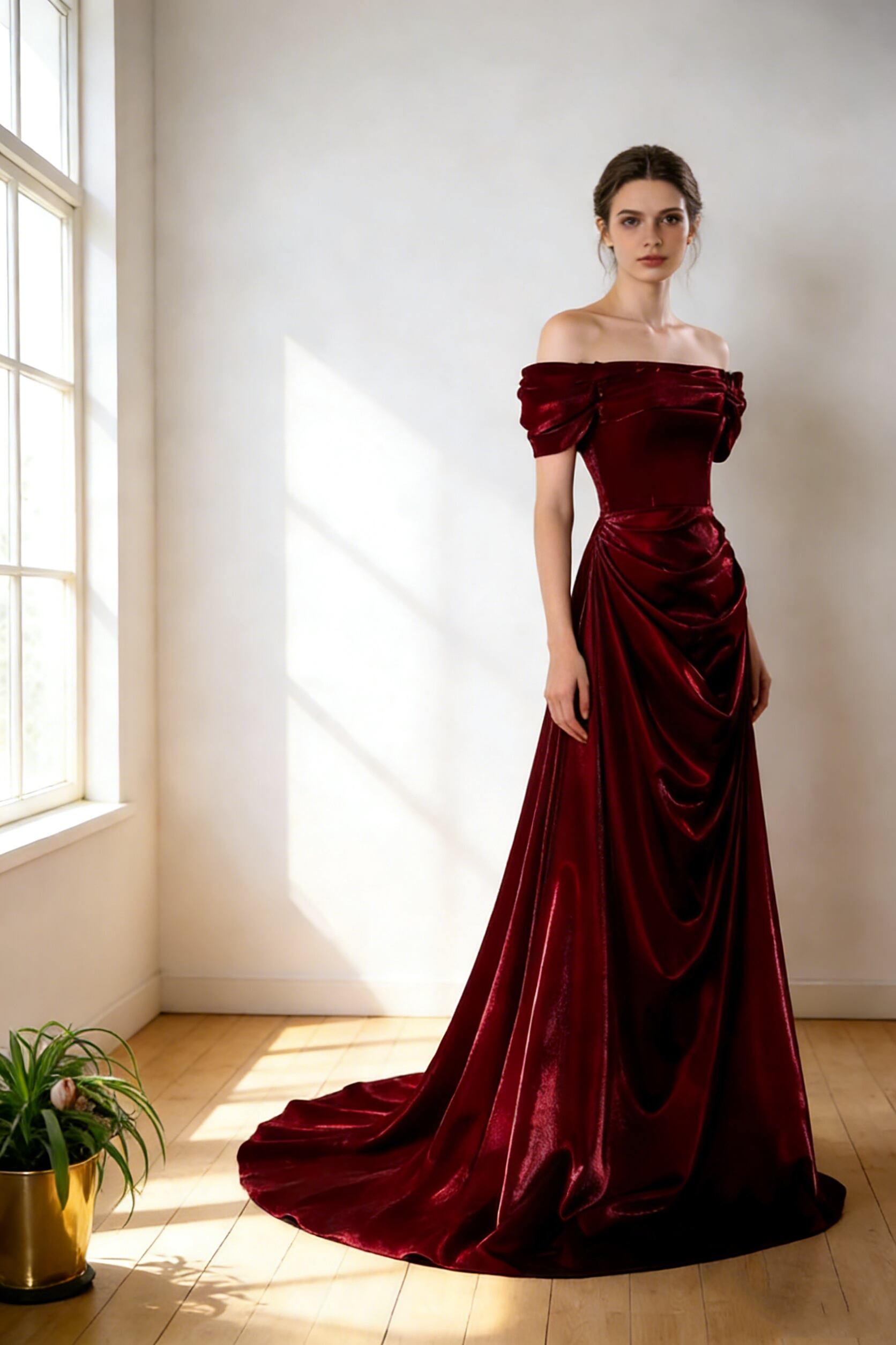 パーティードレス ワインレッド オフショルダー ビロード ハンドドレープ エレガント 前撮り 発表会など