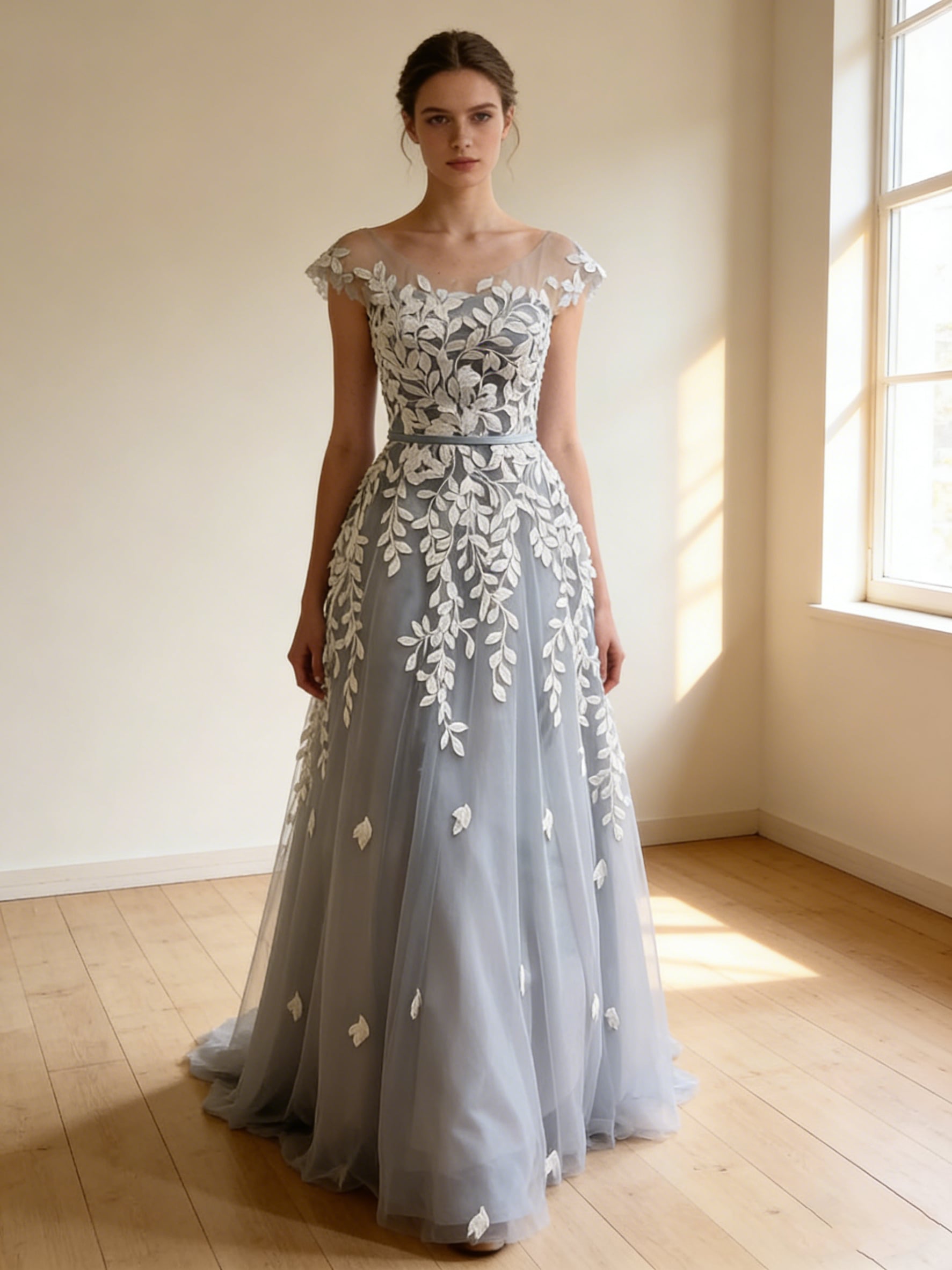カラードレス フレンチスリーブ リーフ刺繍 バックレス ブルーグレー ロングワンピース ピアノ演奏会/音楽会