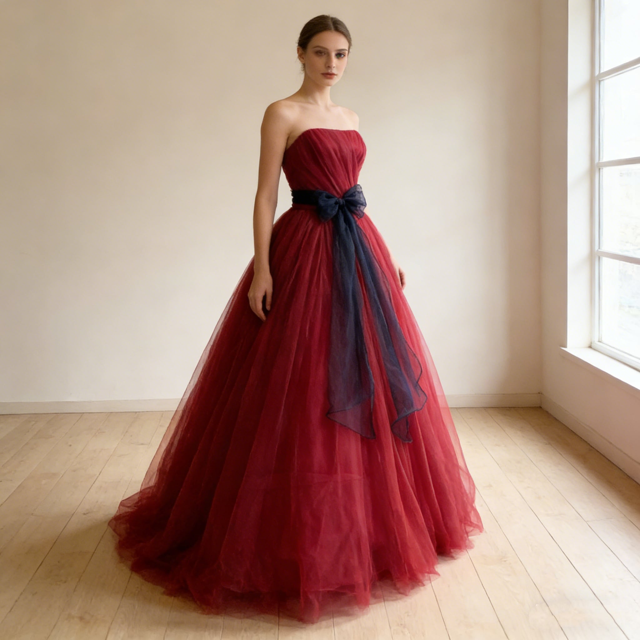 カラードレス ベアトップ サッシュベルト ワインレッド Aライン アンティークなドレス 前撮り 花嫁 ピアノ演奏会