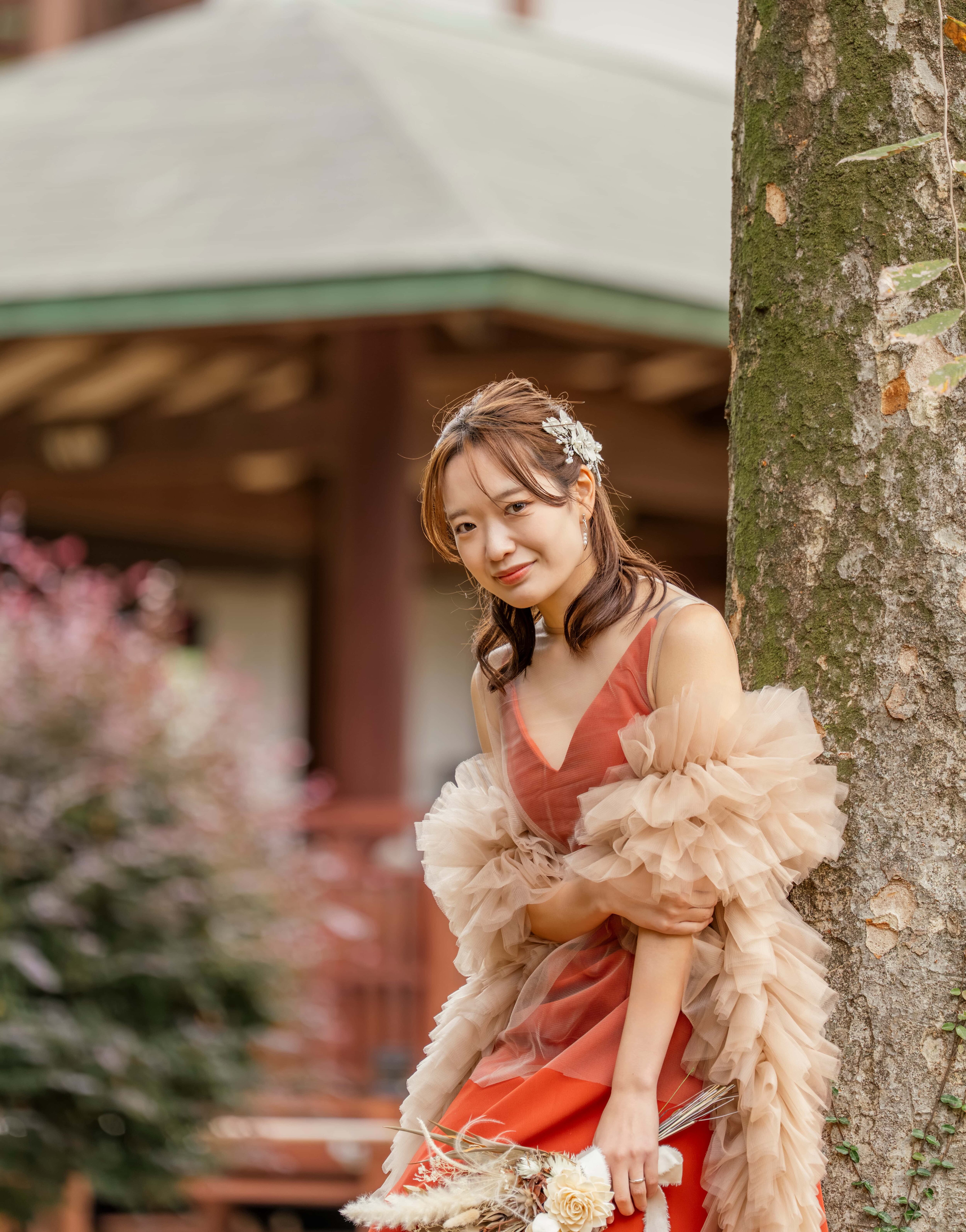 実例写真!パーティードレス ツーピース テラコッタ色 前撮り クレープ生地 エレガント ロングワンピース