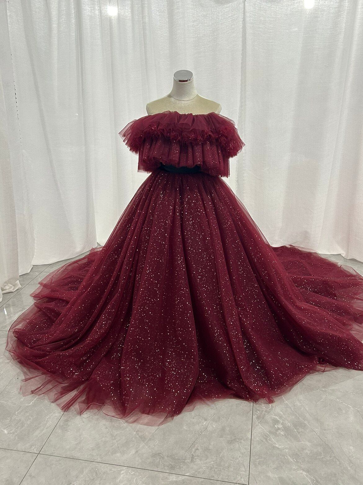 カラードレス ワインレッド オフショルダー キラキラグリッターチュール サッシュベルト ロングトレーン エレガント ブライダル