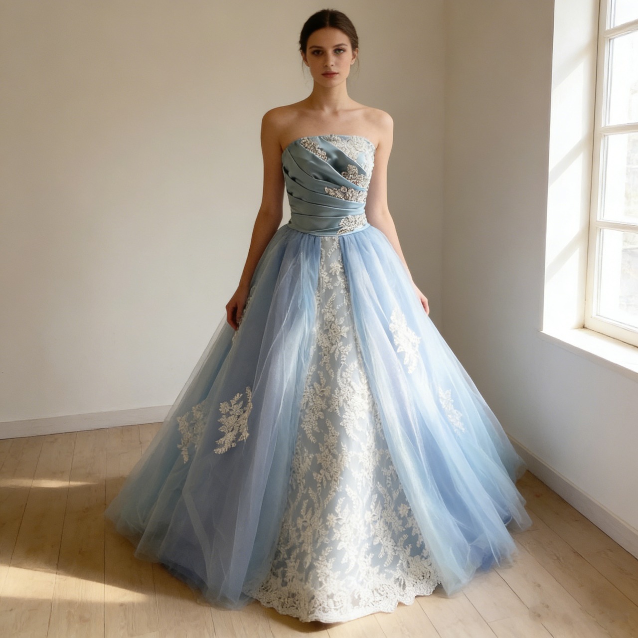 カラードレス ブルーグレー ベアトップ リーフ刺繍 エレガント 結婚式 ピアノ演奏会 魅惑の花レース