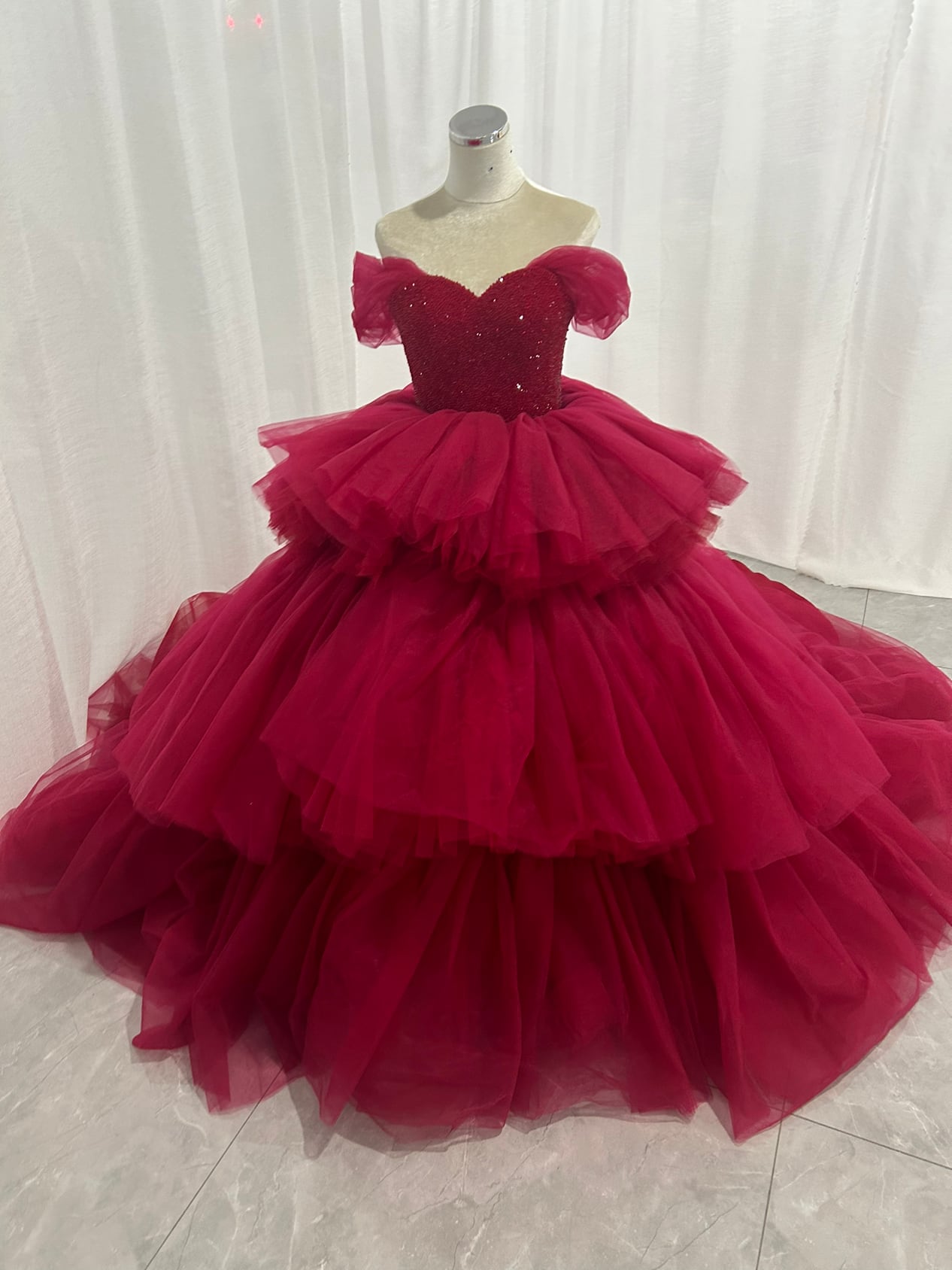 実例写真!カラードレス ボルドー色 オフショルダー ハンドメイド ティアードのドレス 結婚式 抜群におしゃれ度が際立つ