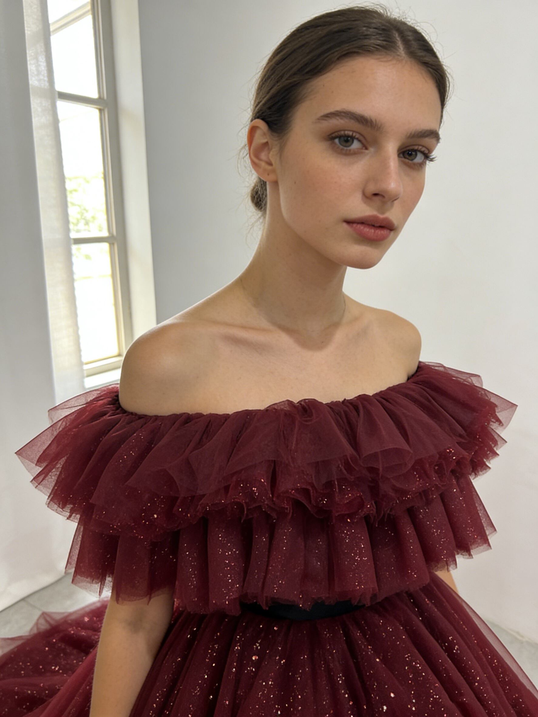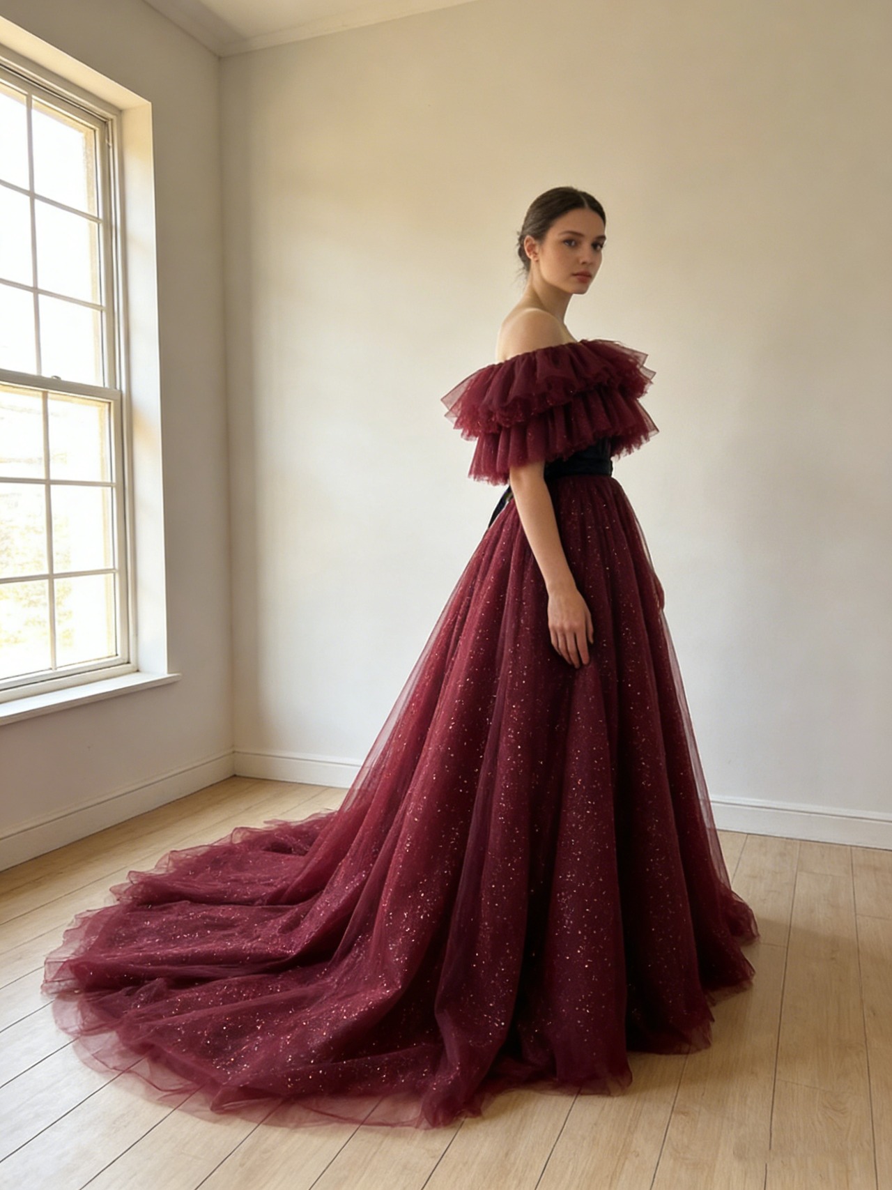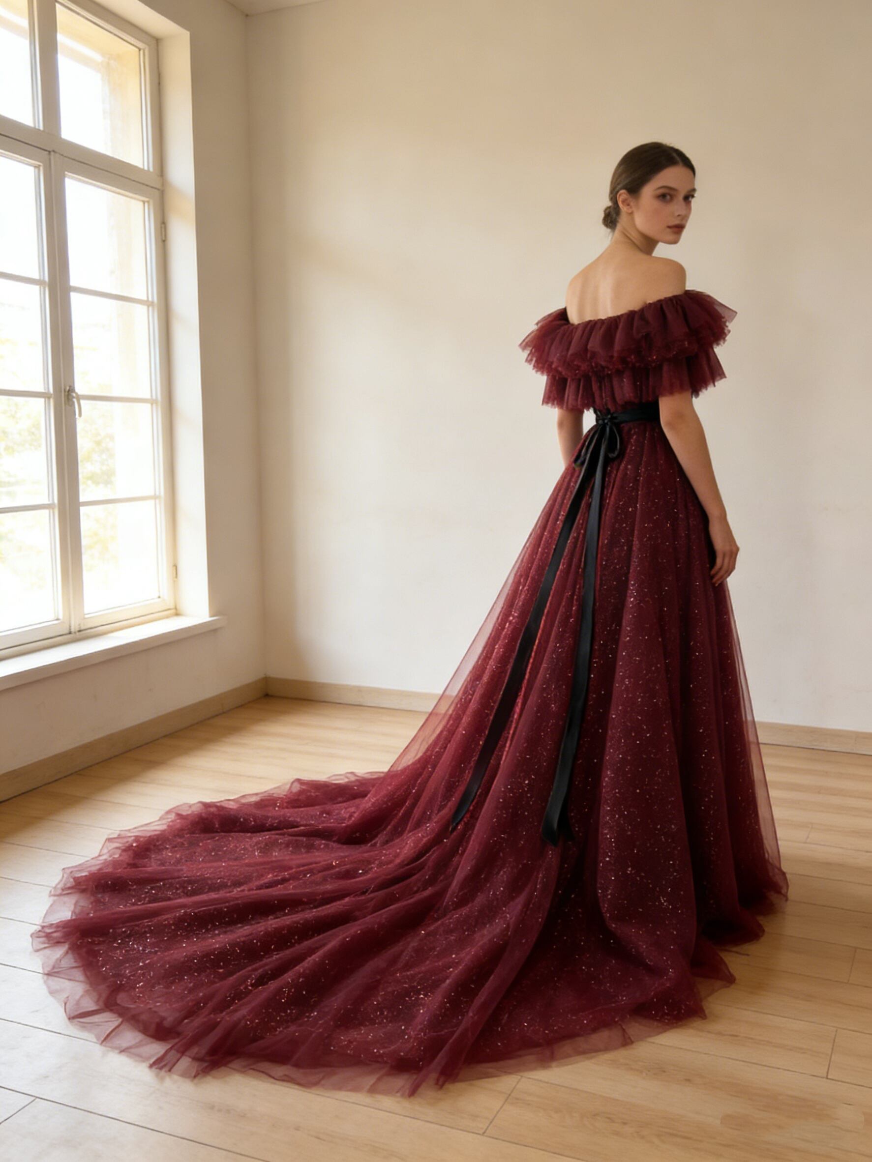 カラードレス ワインレッド オフショルダー キラキラグリッターチュール サッシュベルト ロングトレーン エレガント ブライダル