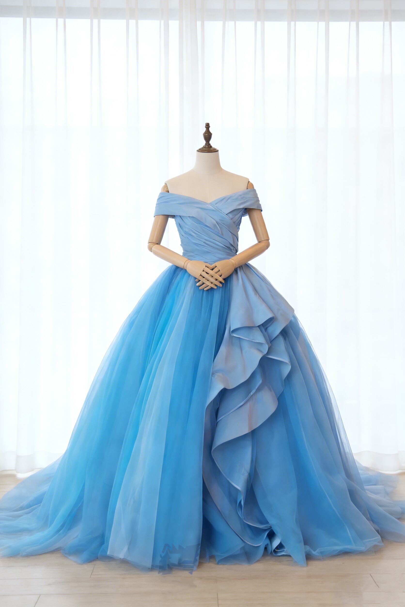 カラードレス オフショルダー チュールスカート ハンドドレープ ラッフルフリル 前撮り 爽やかで優しいブルー