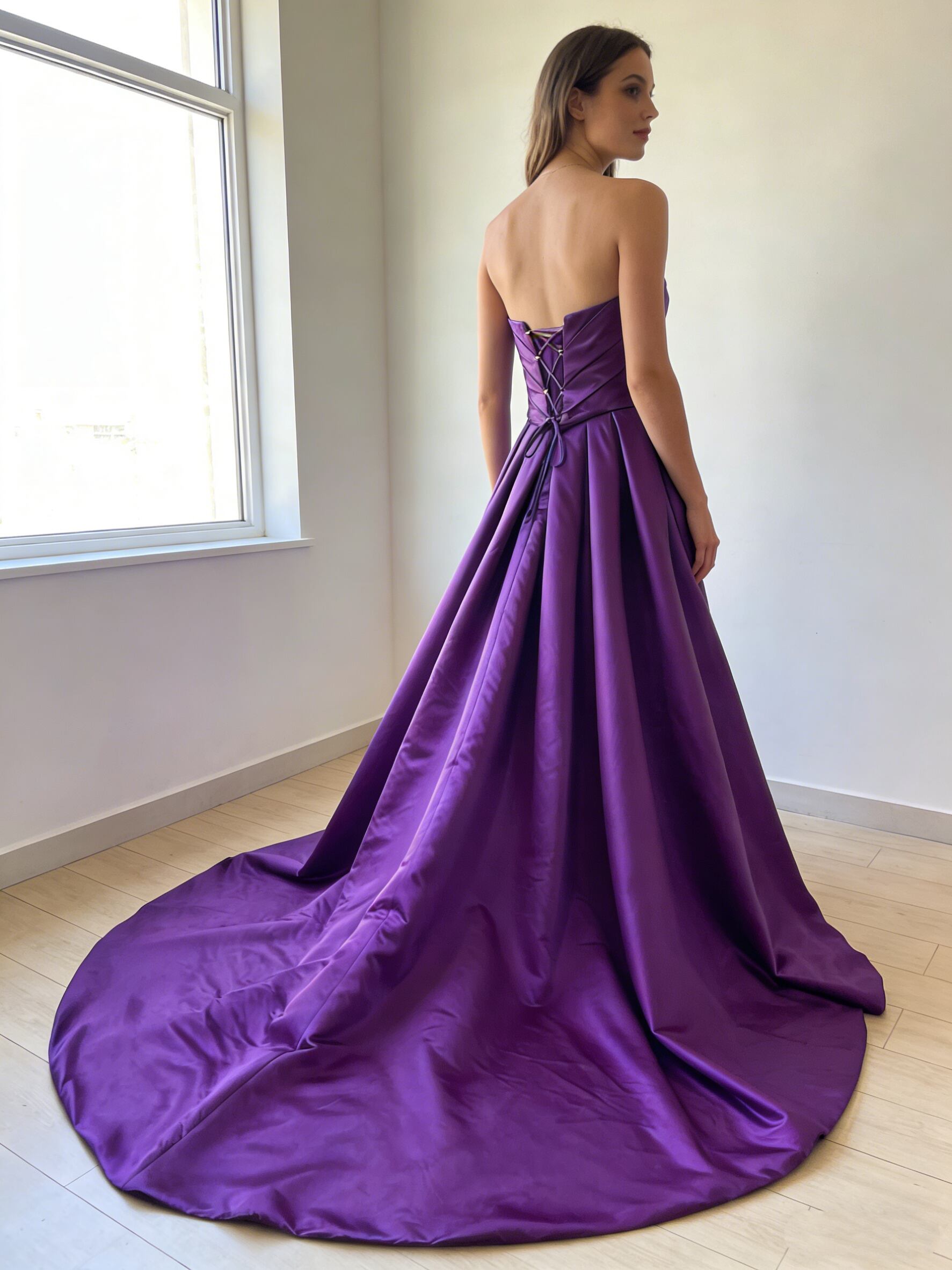 カラードレス パープル ベアトップ ハンドドレープ 編み上げ 光沢サテン エレガント ピアノ演奏会 前撮り